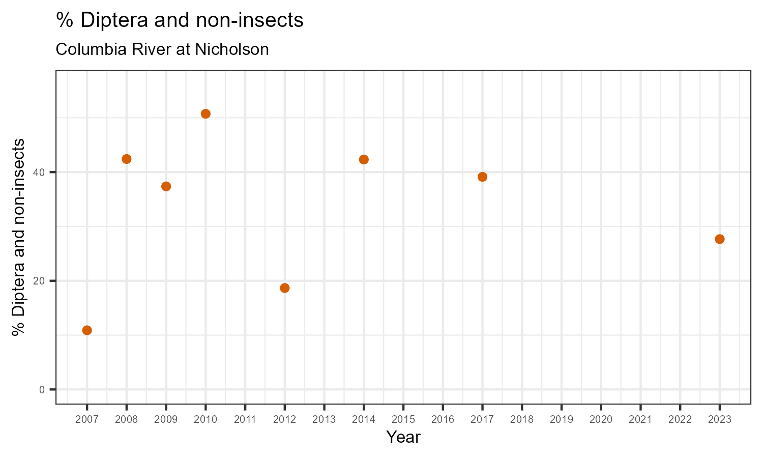 % Diptera and non-insects is the proportion of invertebrates that either are not insects, or are insects in the taxonomic order Diptera. Diptera are flies, and along with non-insects they represent the more pollution tolerant members of the aquatic community. The % Diptera and non-insects may increase in response to habitat disturbances like poor water quality.