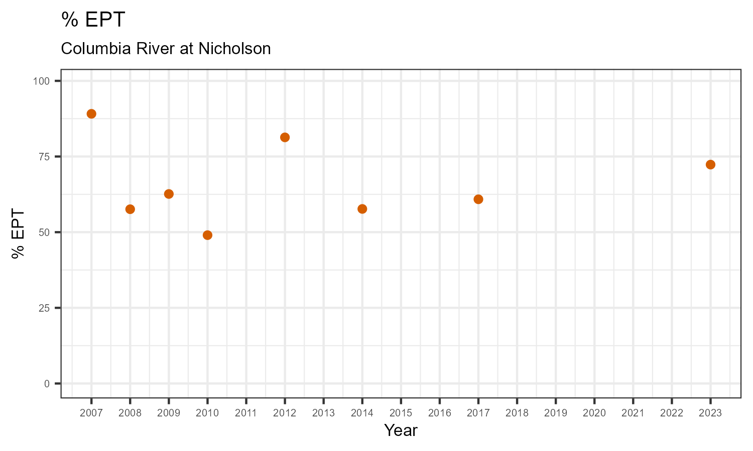 % EPT is the proportion of invertebrates that belong to one of the taxonomic orders of Ephemeroptera (mayflies), Plecoptera (stoneflies), or Trichoptera (caddisflies). These types of insects are often grouped together under the term “EPT”. They are typically the most sensitive to habitat disturbances like poor water quality.