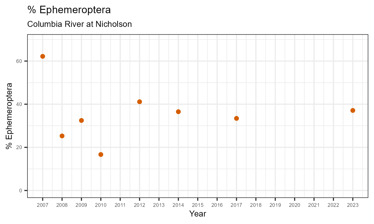 % Ephemeroptera is the proportion of invertebrates that belong to the taxonomic order Ephemeroptera. Ephemeroptera are commonly called mayflies. They are sensitive to pollution. The % Ephemeroptera may decrease in response to habitat disturbances like poor water quality.
