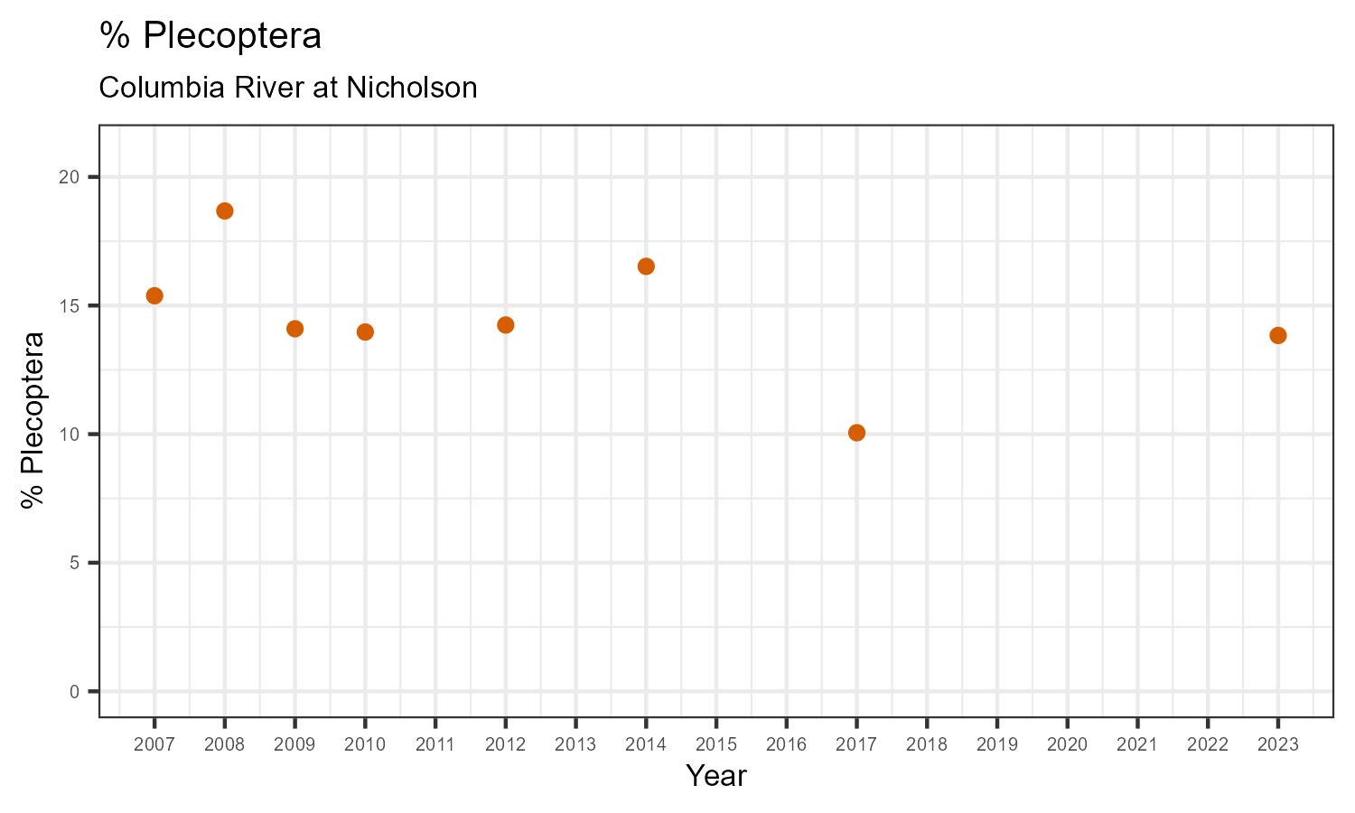 % Plecoptera is the proportion of invertebrates that belong to the taxonomic order Plecoptera. Plecoptera are commonly called stoneflies. They are sensitive to pollution. The % Plecoptera may decrease in response to habitat disturbances like poor water quality.