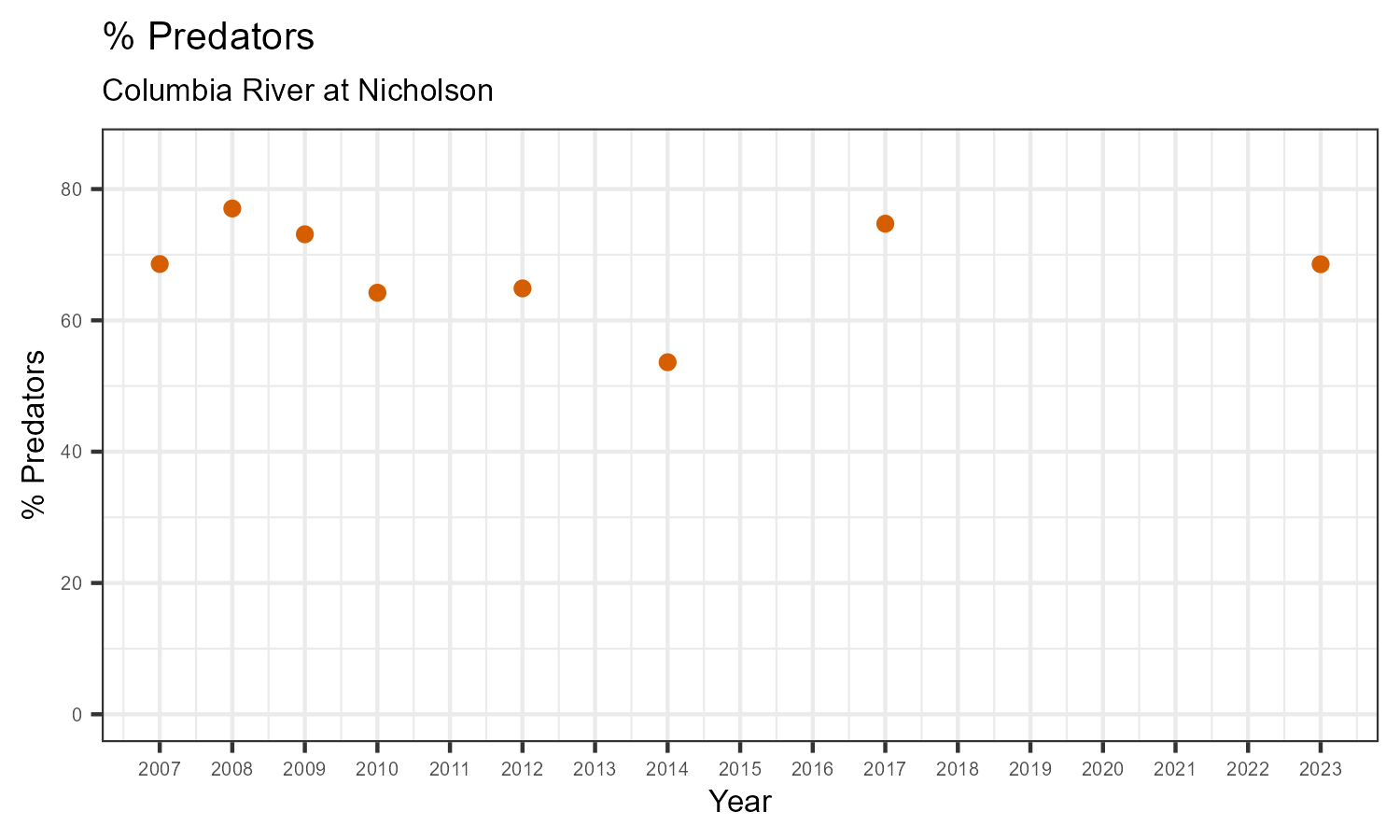 % Predators is the proportion of taxonomic familes present that feed primarily on other organisms. The proportion of predators is expected to decline at a site in response to disturbance.