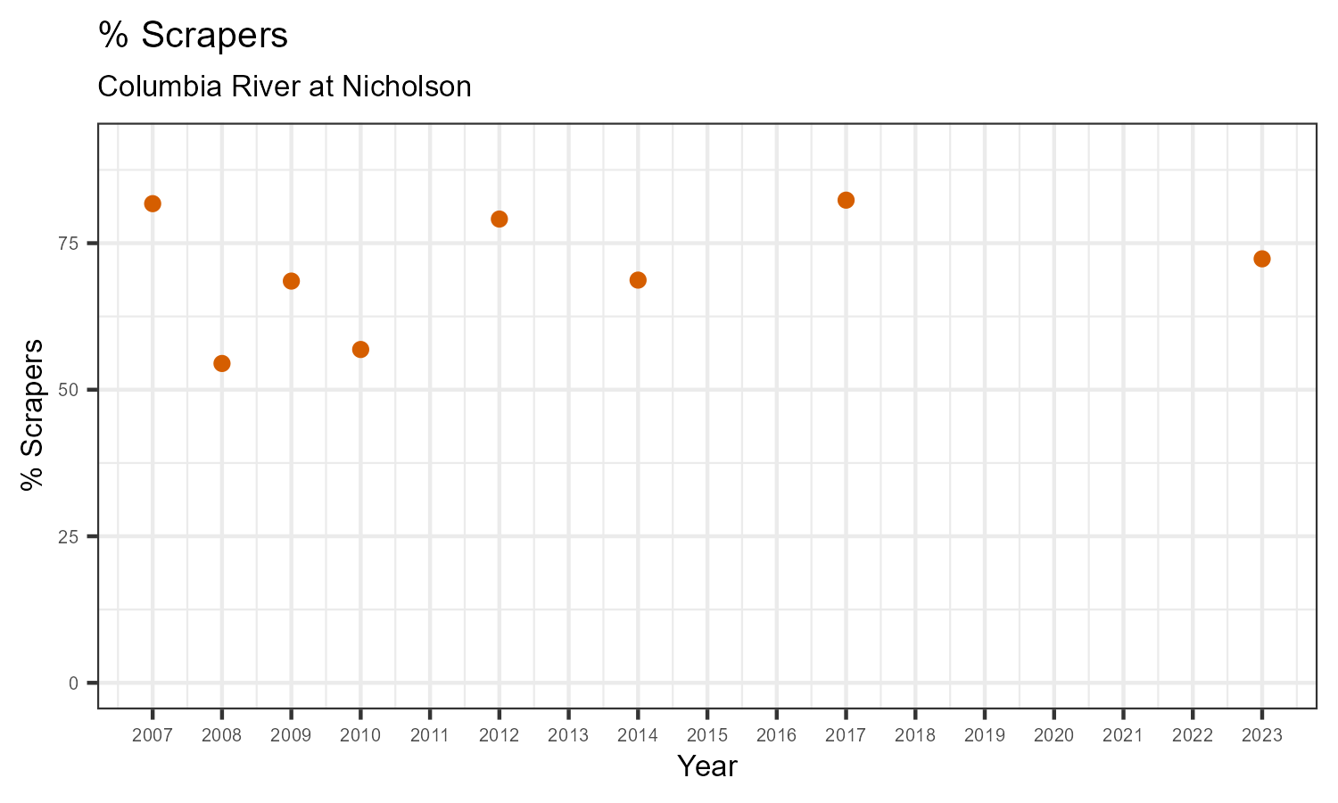 % Scrapers is the proportion of taxonomic familes present that feed by grazing on the algae growing on rocks and other underwater surfaces. The proportion of scrapers is expected to decrease at a site in response to disturbance.