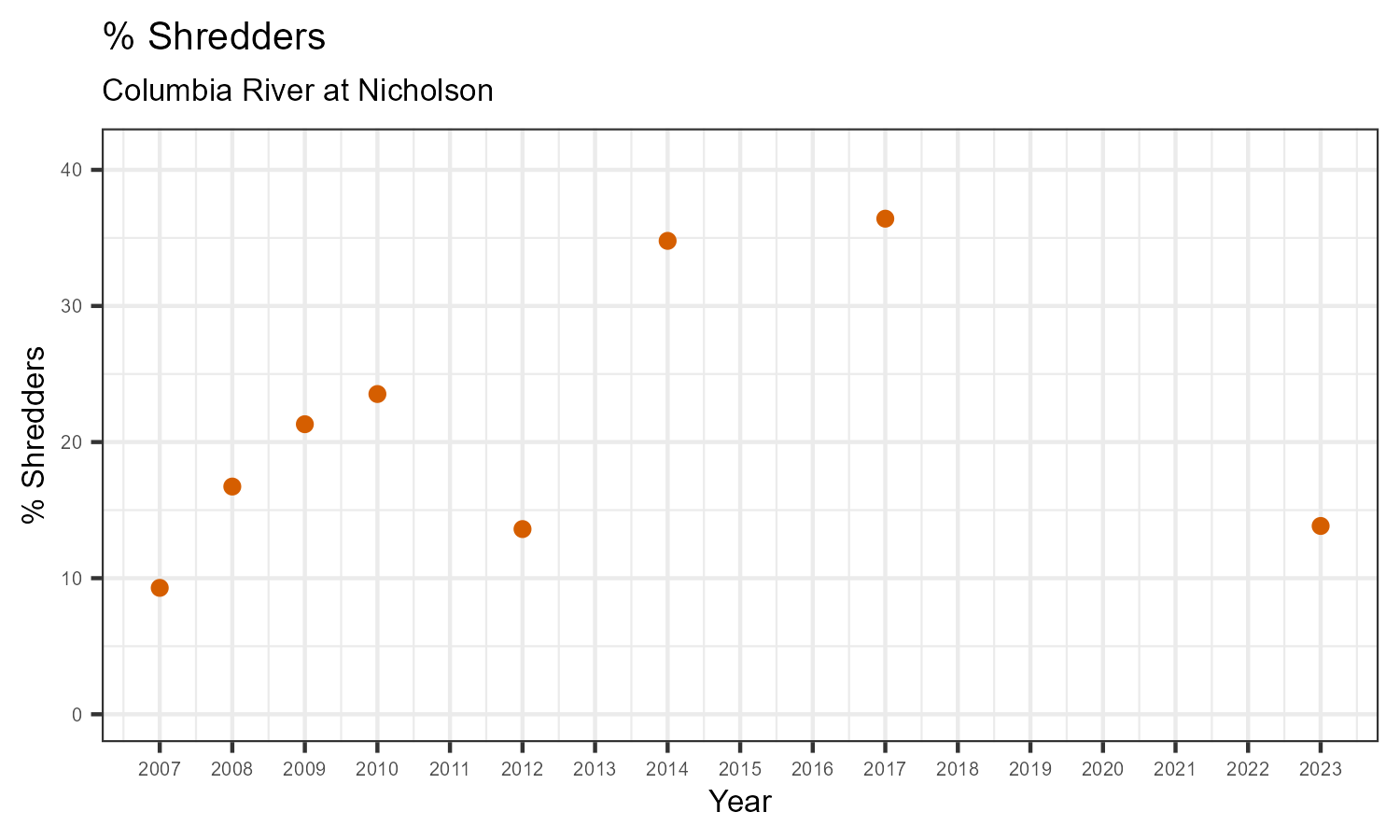 % Shredders is the proportion of taxonomic familes present that feed on leaf litter and other coarse particulate organic matter in the water. The proportion of shredders is expected to decrease at a site in response to disturbance.