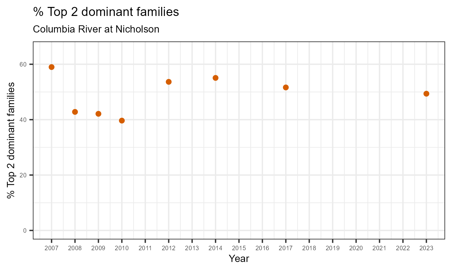 | % Top 2 dominant families | 58.99 | 42.80 | 42.11 | 39.66 | 53.65 | 55.07 | 51.63 | 49.37 |