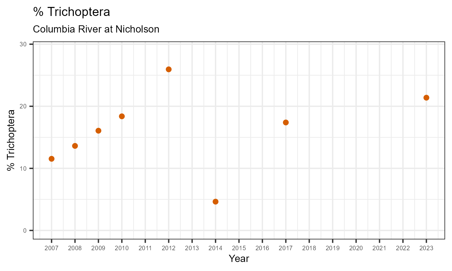 % Trichoptera is the proportion of invertebrates that belong to the taxonomic order Trichoptera. Trichoptera are commonly called caddisflies. They are sensitive to pollution. The % Trichoptera may decrease in response to habitat disturbances like poor water quality.