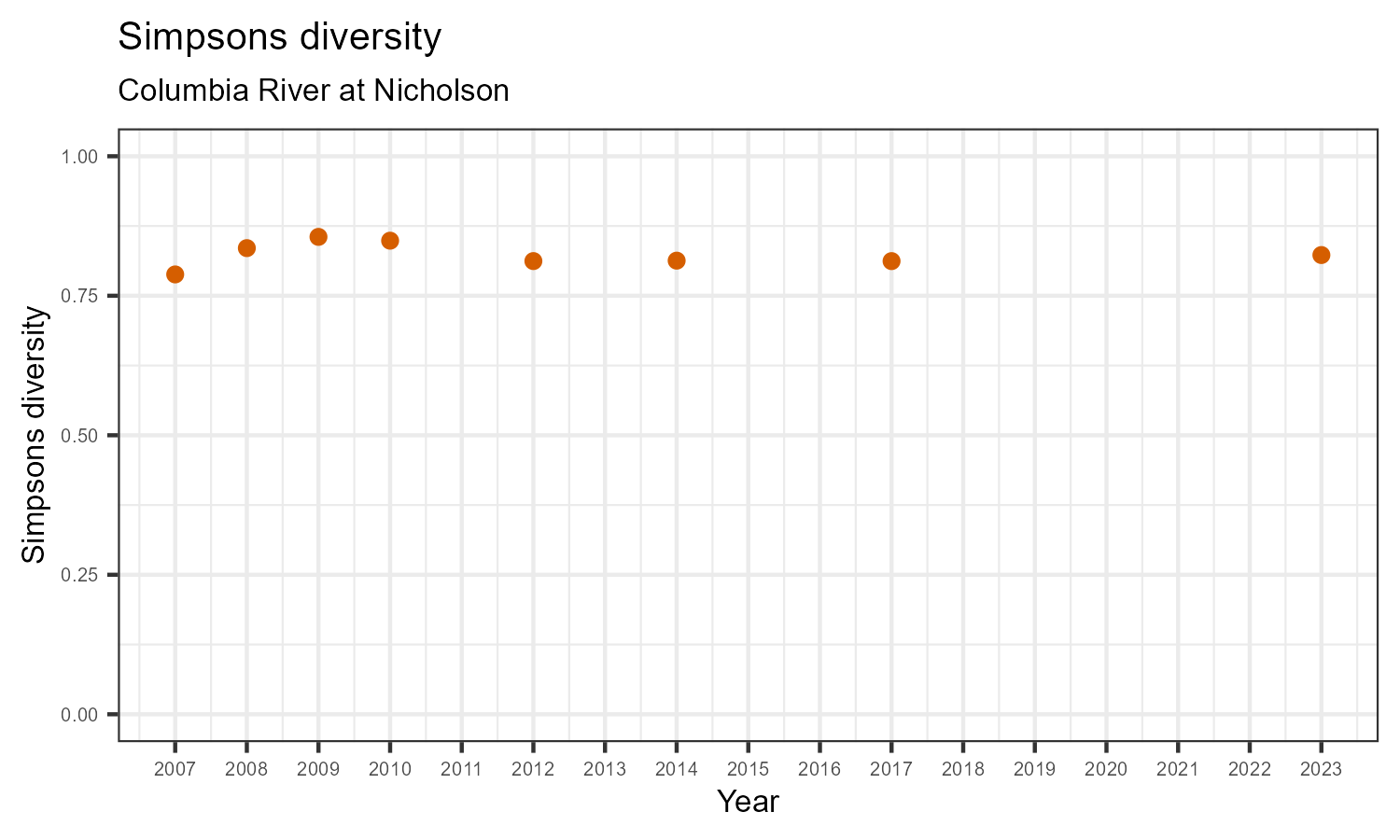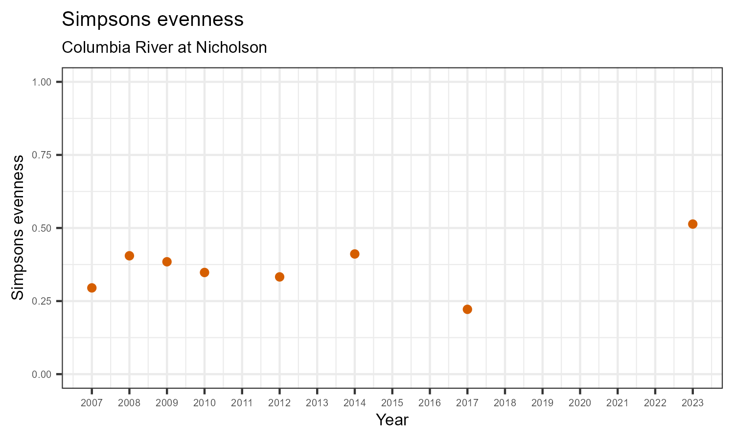 Simpson’s evenness is an index that measures whether the number of individuals in various taxonomic families is similar, or balanced. Balanced communities are an indicator of a healthy ecosystem. Simpson’s evenness may decrease in response to habitat disturbances.