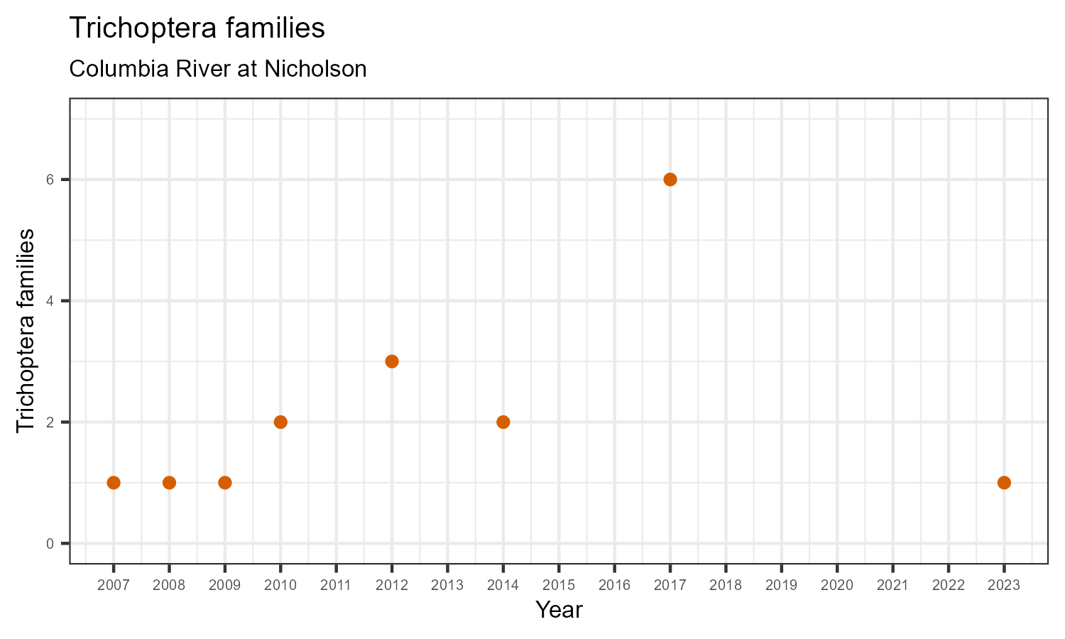Trichoptera family richness is measured by counting how many taxonomic families in a sample belong to the order Trichoptera. Trichoptera are commonly known as caddisflies. They are pollution sensitive, so Trichoptera family richness may decrease in response to habitat disturbances like poor water quality.