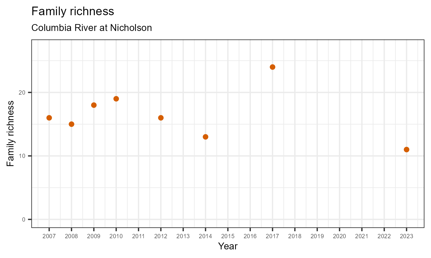 Family richness is the total number of taxonomic families identified. Family richness can decline in response to habitat disturbances or introduction of invasive species.