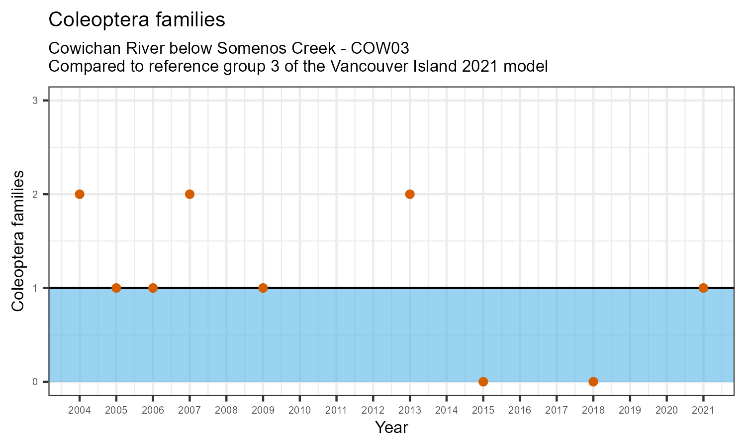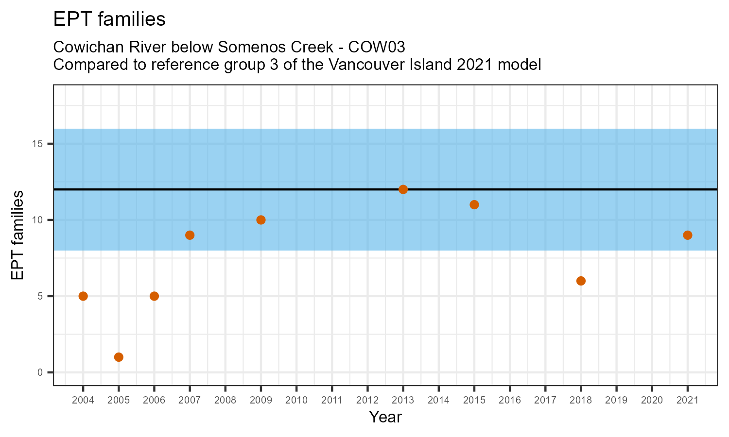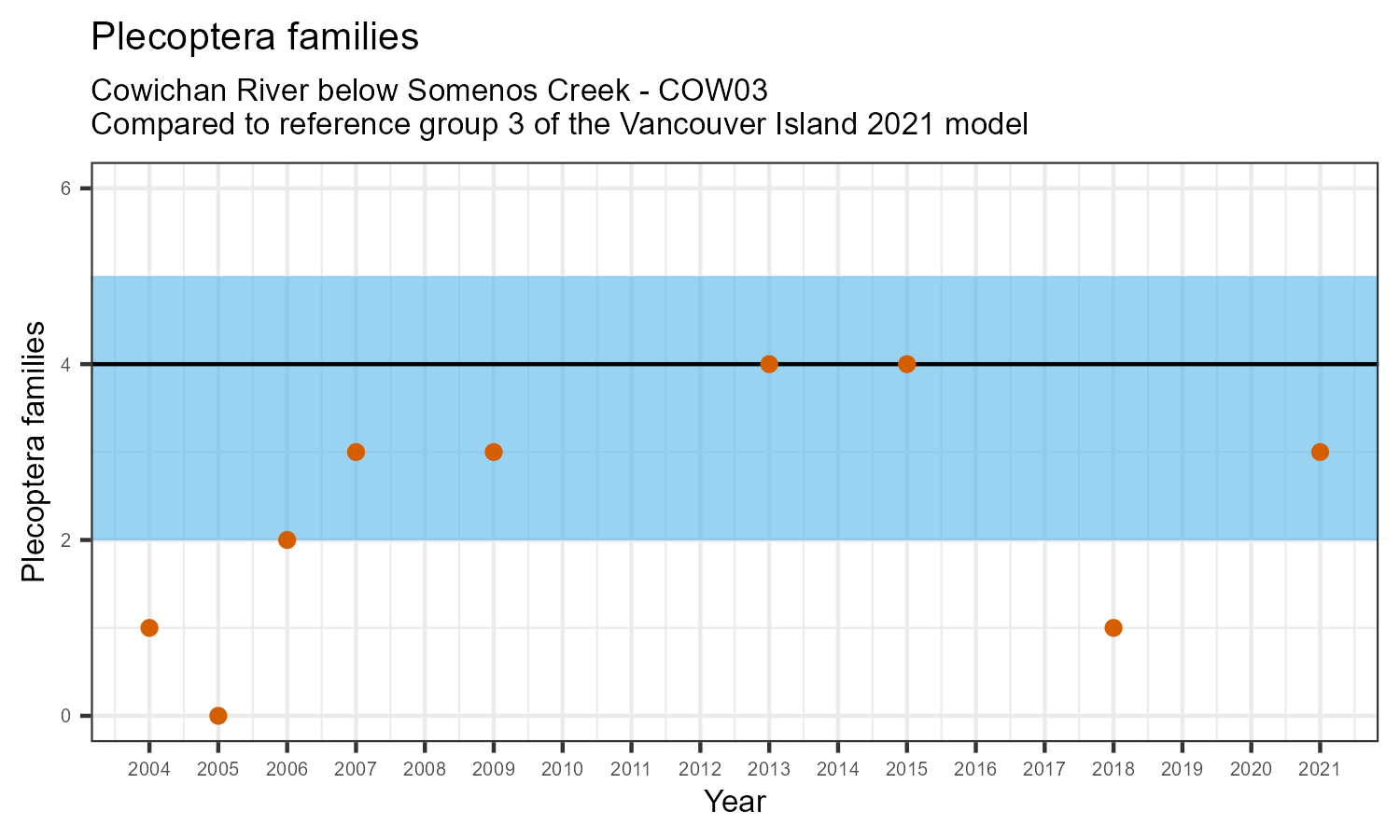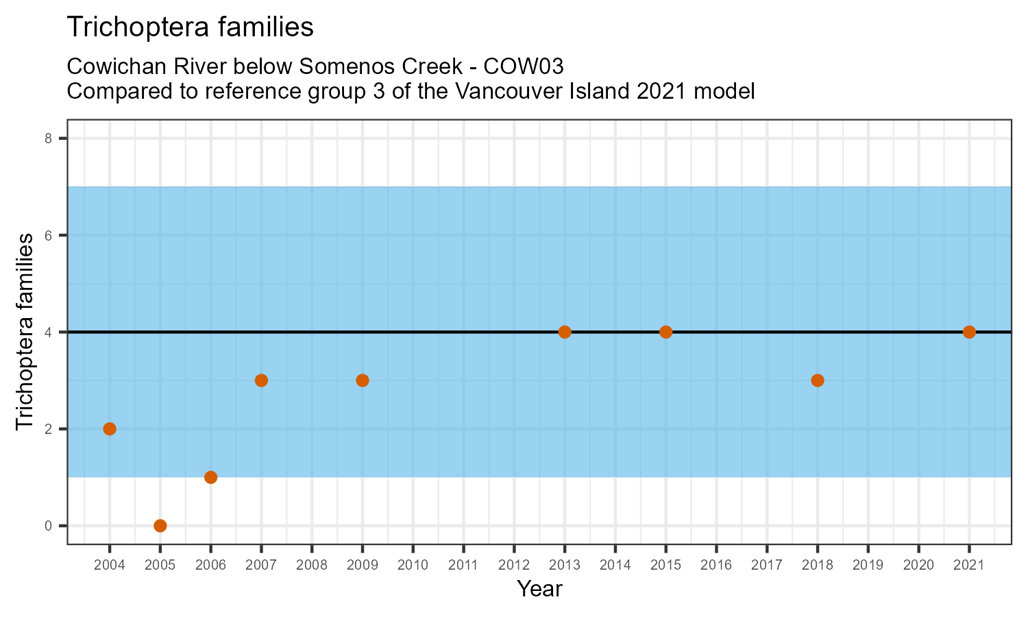 The number of families observed at this station was divided by the number of families found at more than half of similar reference sites. In 2021 the O:E ratio for this station was 0.93.