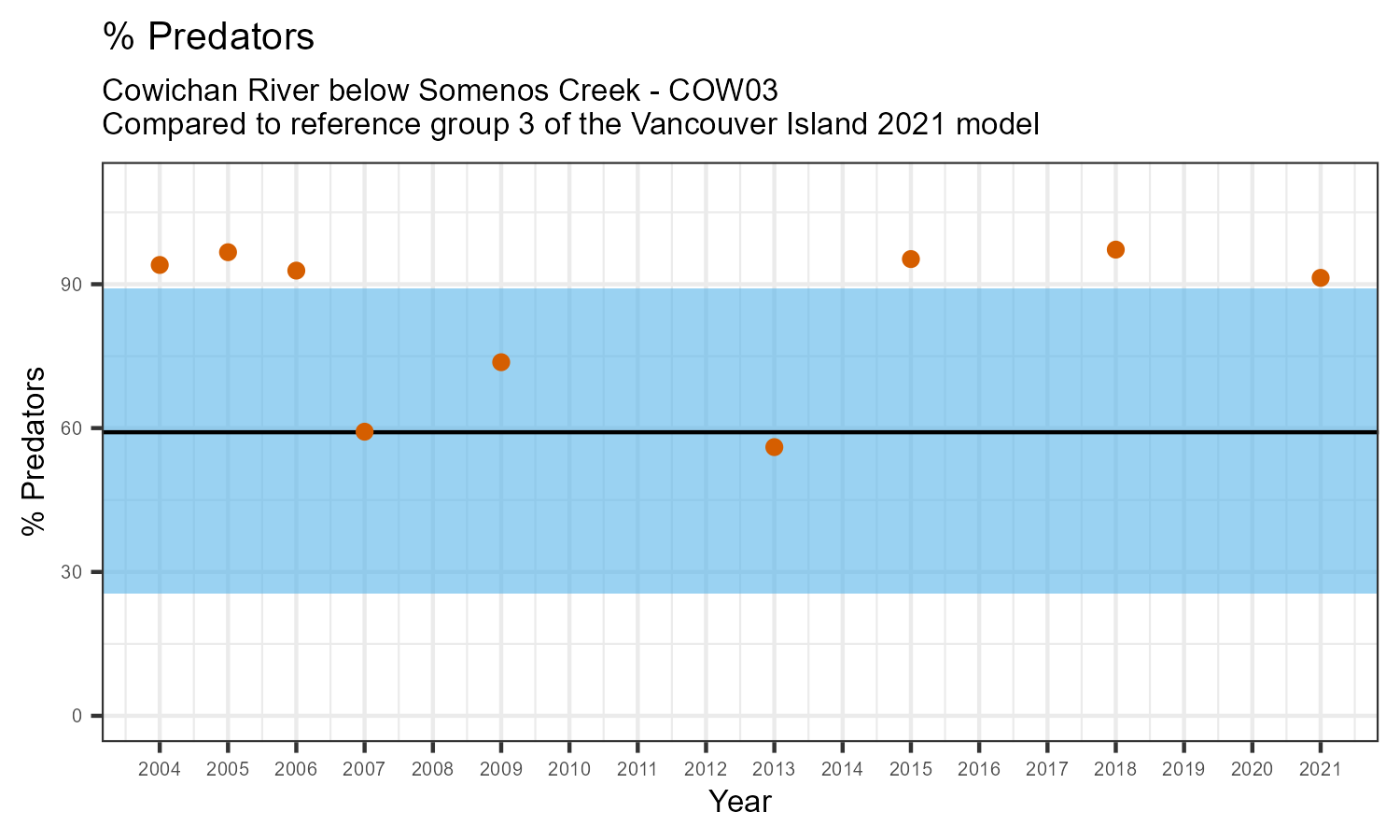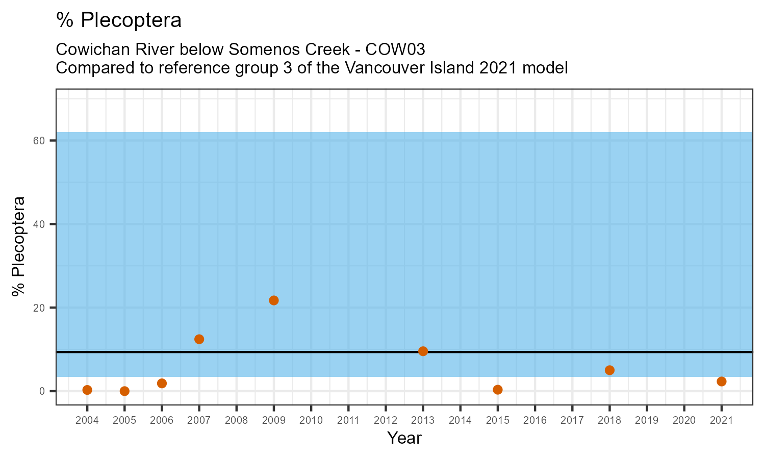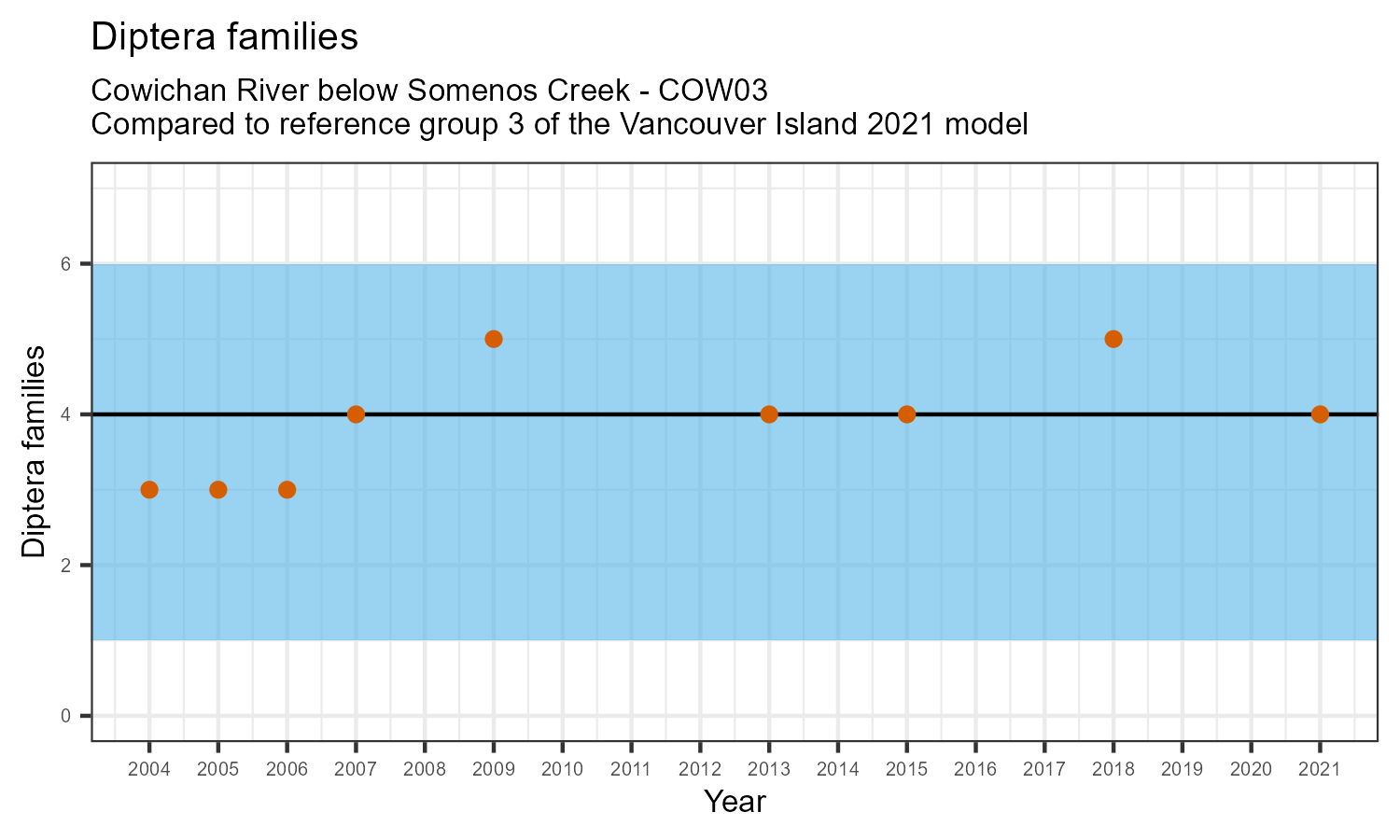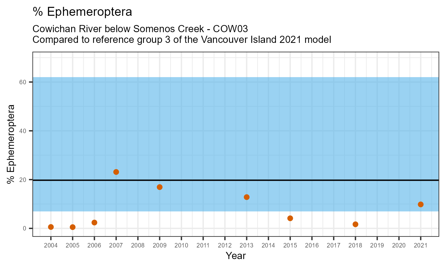 The biological condition at this station was assessed for 2021, the most recent year of sampling. The benthic macroinvertebrate community was analysed by comparing it to similar sites in a CABIN reference model for the Vancouver Island region.
