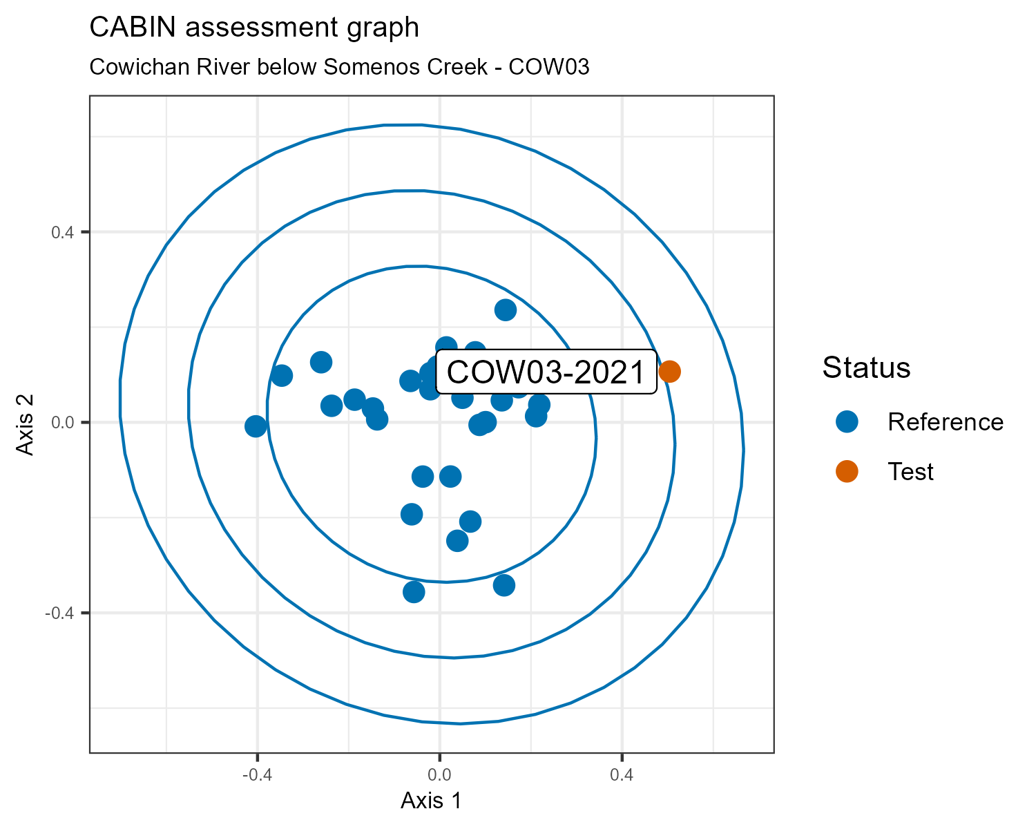 A CABIN assessment considers this water quality monitoring station the “test” site, and compares it to a group of sites with similar habitat features from the Vancouver Island 2021 CABIN reference model. Sites in the reference model have little or no human activity in their watersheds, so they are considered to represent pristine or best possible biological conditions. If the test site is close to the reference sites on the plot, it is also considered to be in good biological condition.