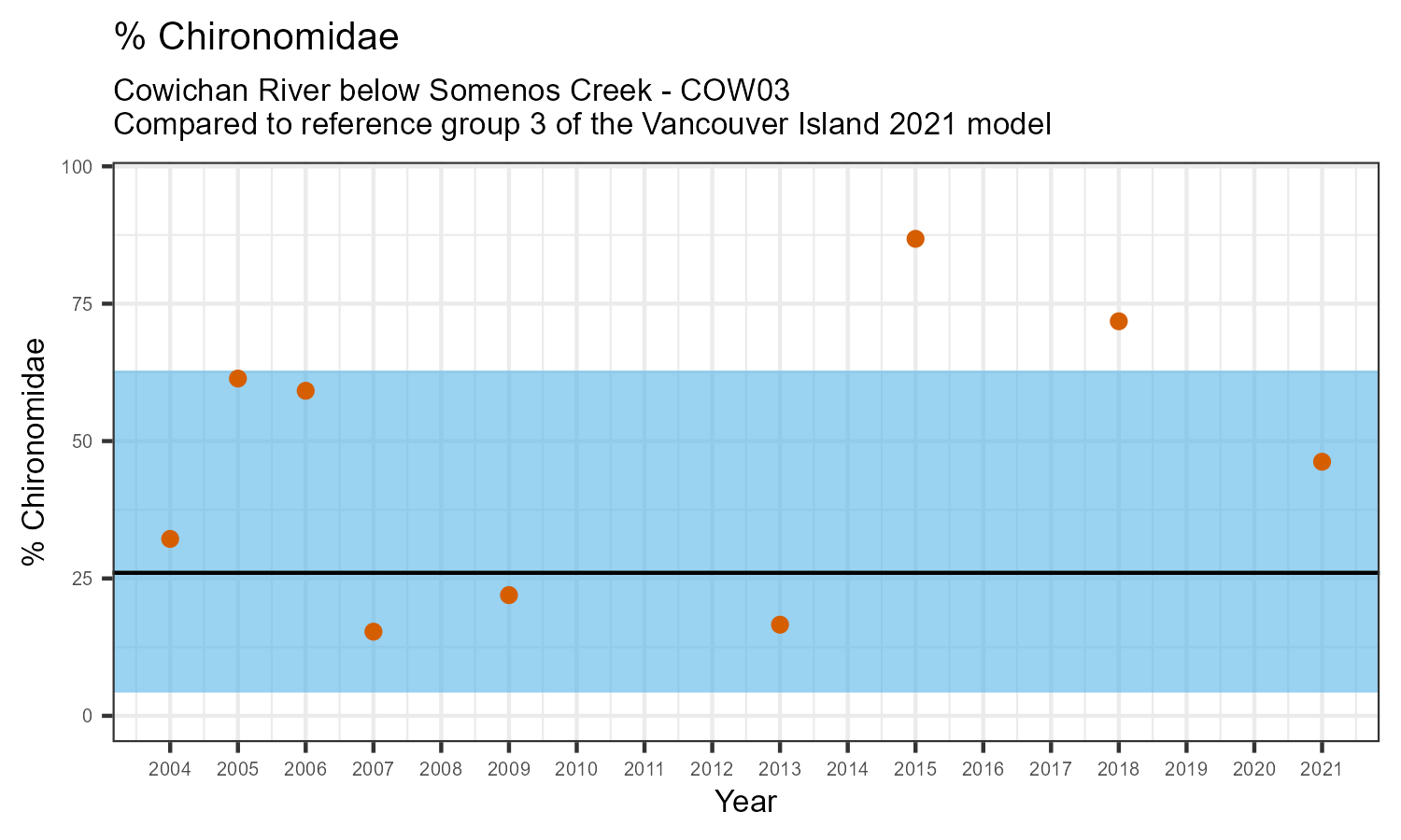 % Chironomidae is the proportion of invertebrates that belong to the taxonomic family Chironomidae. Chironomidae are non-biting midges and are often the most abundant family in a stream. Their pollution tolerance varies widely between different species.