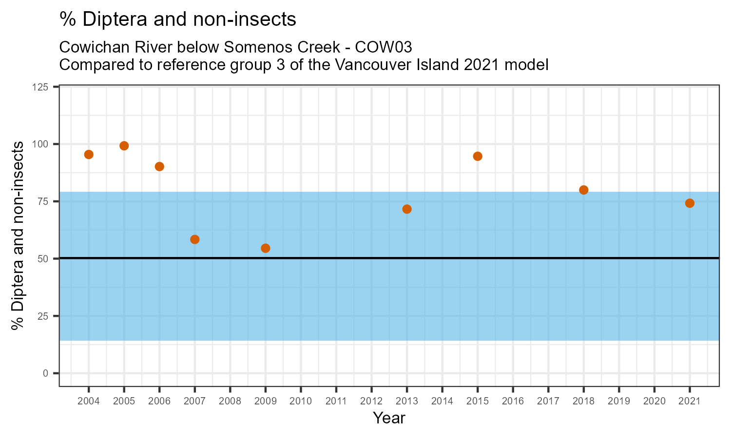 % Diptera and non-insects is the proportion of invertebrates that either are not insects, or are insects in the taxonomic order Diptera. Diptera are flies, and along with non-insects they represent the more pollution tolerant members of the aquatic community. The % Diptera and non-insects may increase in response to habitat disturbances like poor water quality.