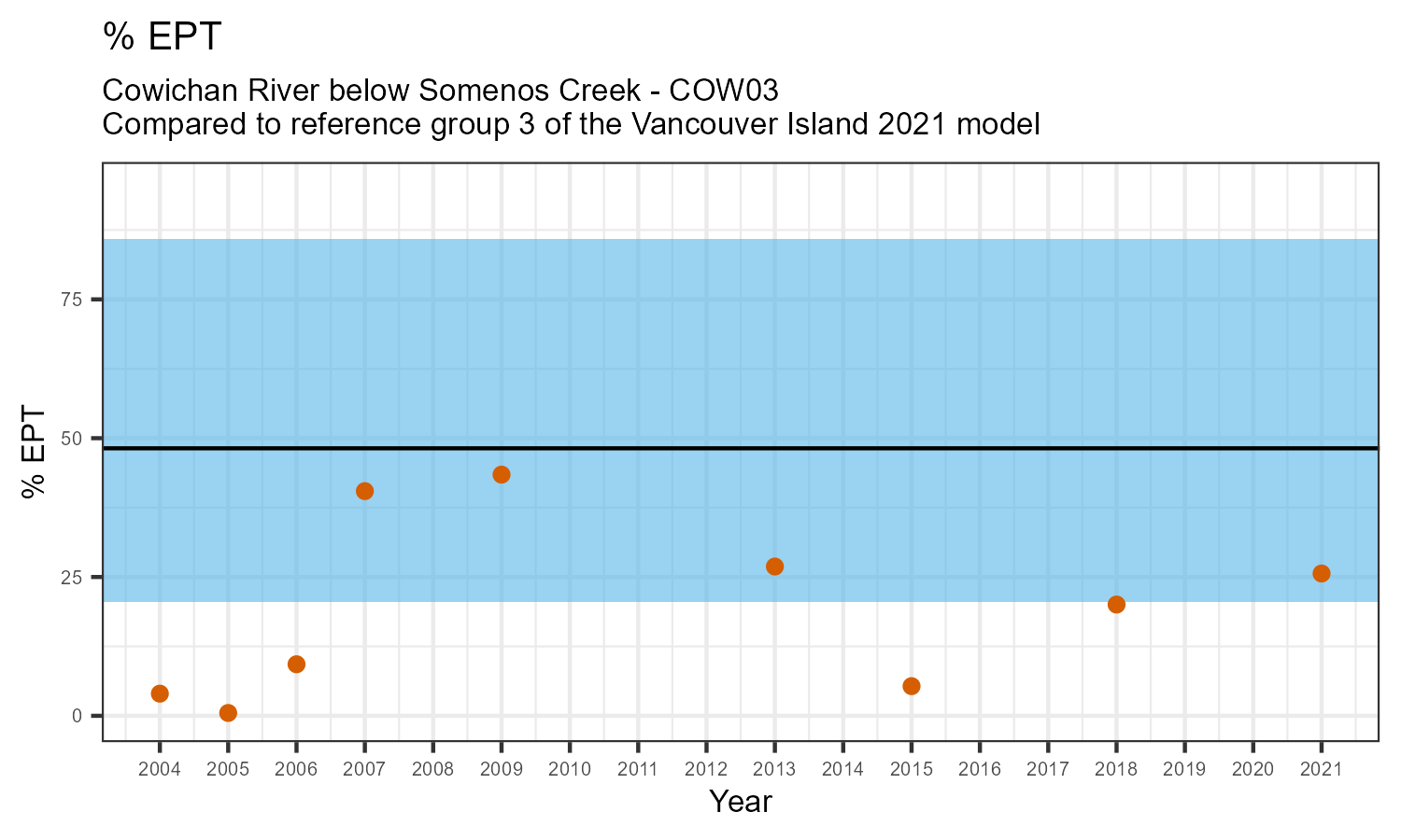 % EPT is the proportion of invertebrates that belong to one of the taxonomic orders of Ephemeroptera (mayflies), Plecoptera (stoneflies), or Trichoptera (caddisflies). These types of insects are often grouped together under the term “EPT”. They are typically the most sensitive to habitat disturbances like poor water quality.