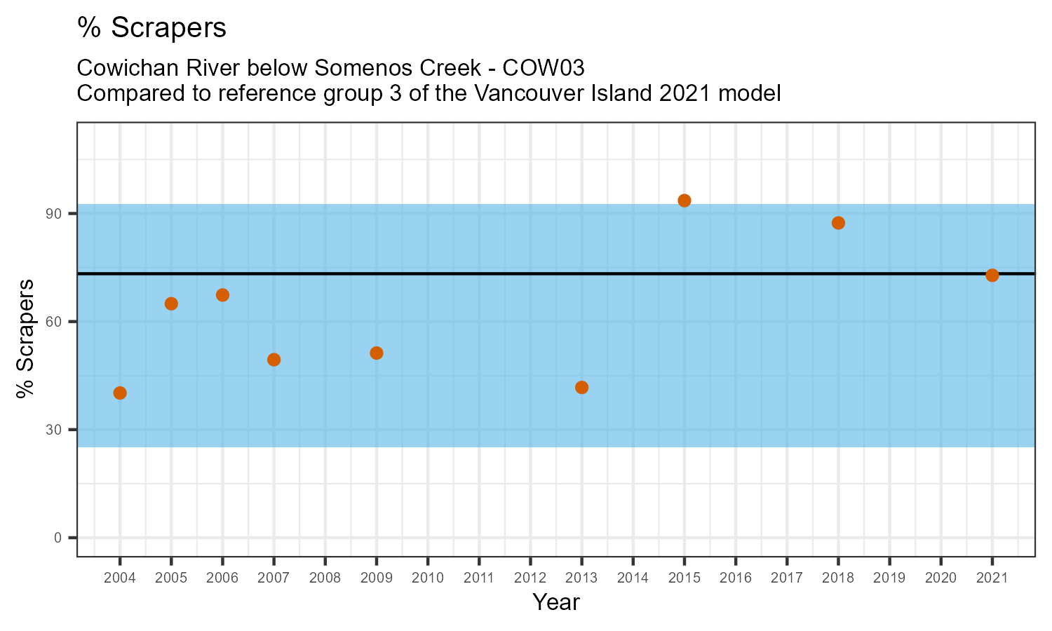 % Scrapers is the proportion of taxonomic familes present that feed by grazing on the algae growing on rocks and other underwater surfaces. The proportion of scrapers is expected to decrease at a site in response to disturbance.