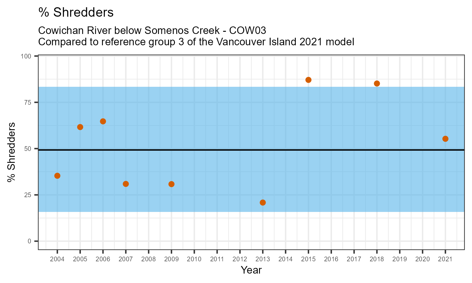 % Shredders is the proportion of taxonomic familes present that feed on leaf litter and other coarse particulate organic matter in the water. The proportion of shredders is expected to decrease at a site in response to disturbance.