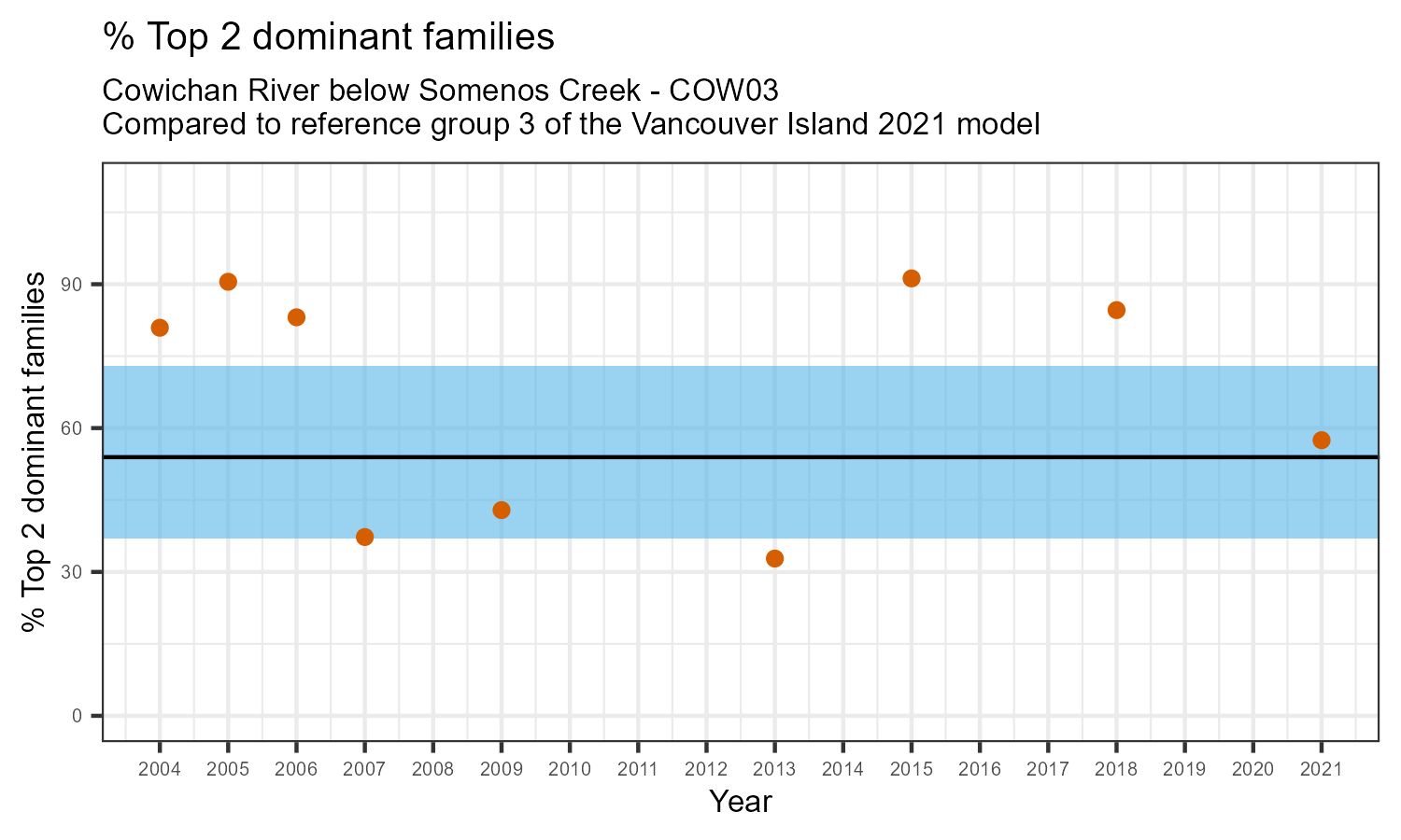 % Top 2 dominant families is the proportion of the total sample represented by the two most abundant families of invertebrates. A healthy aquatic community should have a balance of many types of invertebrates. If only one or two families dominate the community, this can be a sign of habitat disturbance. The percentage of the two most dominant families in the community may increase in response to disturbance.