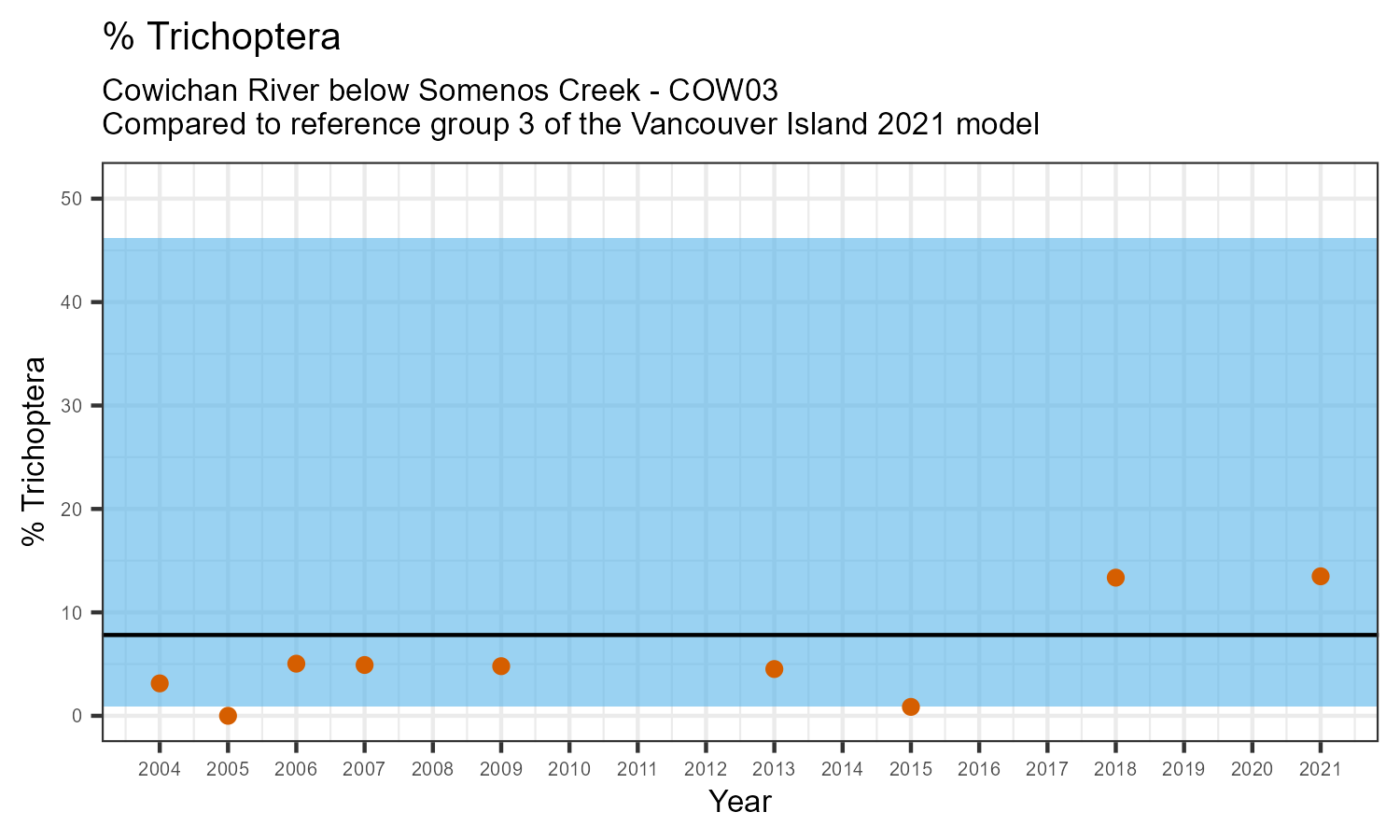 % Trichoptera is the proportion of invertebrates that belong to the taxonomic order Trichoptera. Trichoptera are commonly called caddisflies. They are sensitive to pollution. The % Trichoptera may decrease in response to habitat disturbances like poor water quality.