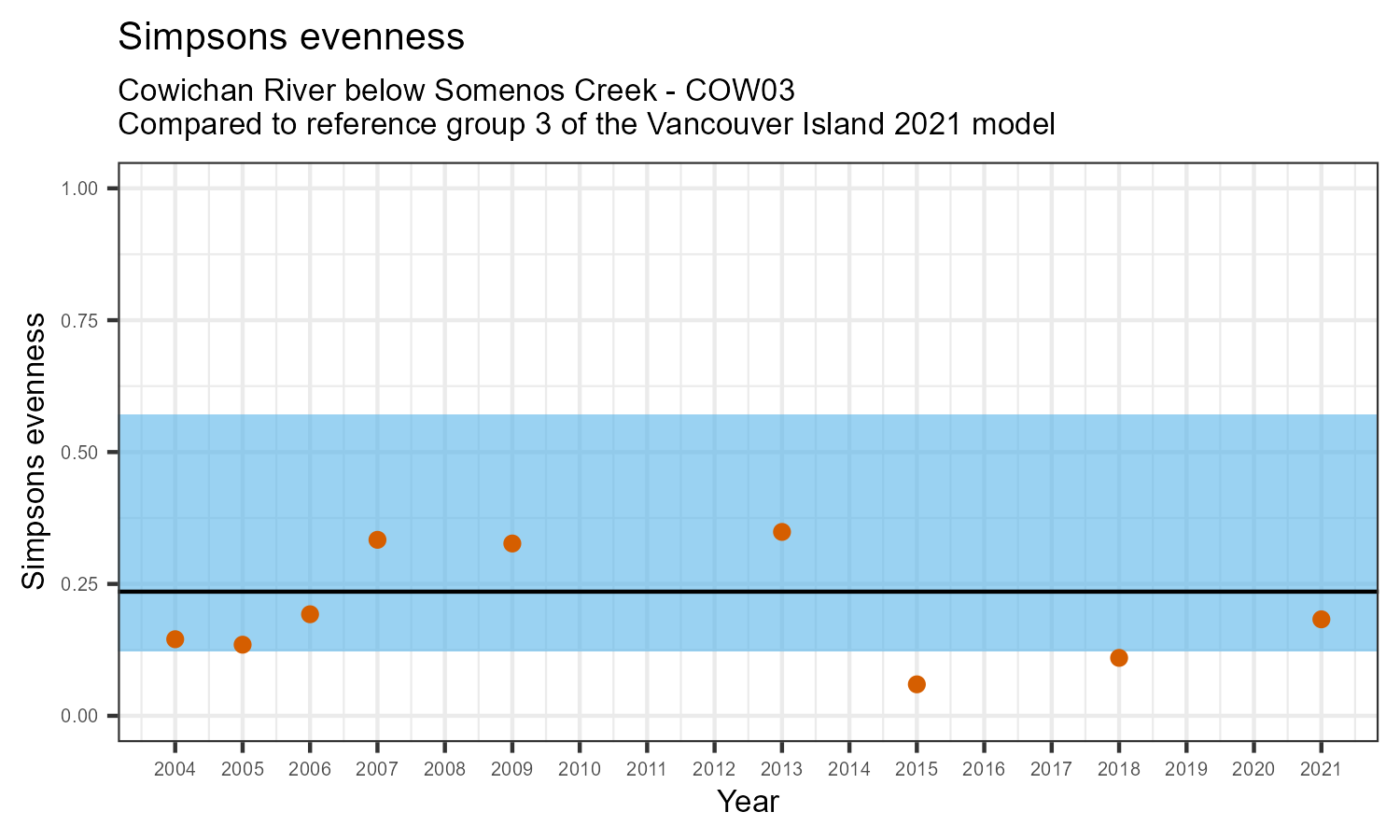 Simpson’s evenness is an index that measures whether the number of individuals in various taxonomic families is similar, or balanced. Balanced communities are an indicator of a healthy ecosystem. Simpson’s evenness may decrease in response to habitat disturbances.