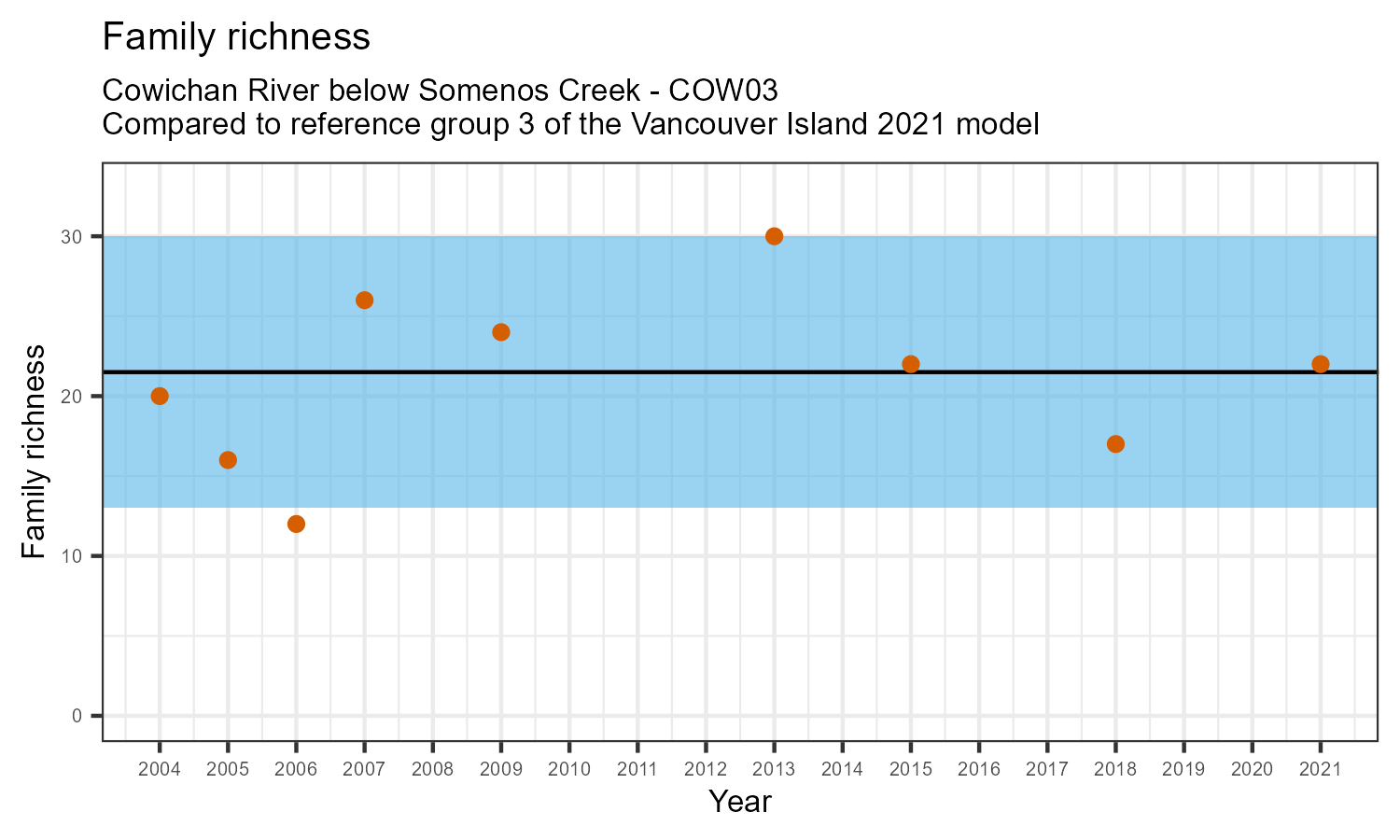 Family richness is the total number of taxonomic families identified. Family richness can decline in response to habitat disturbances or introduction of invasive species.