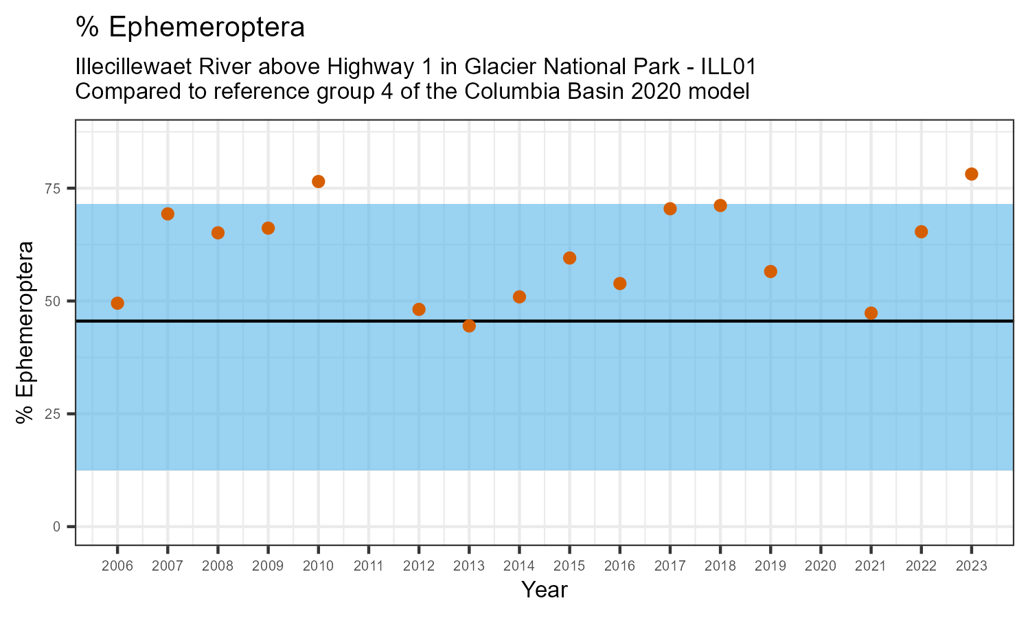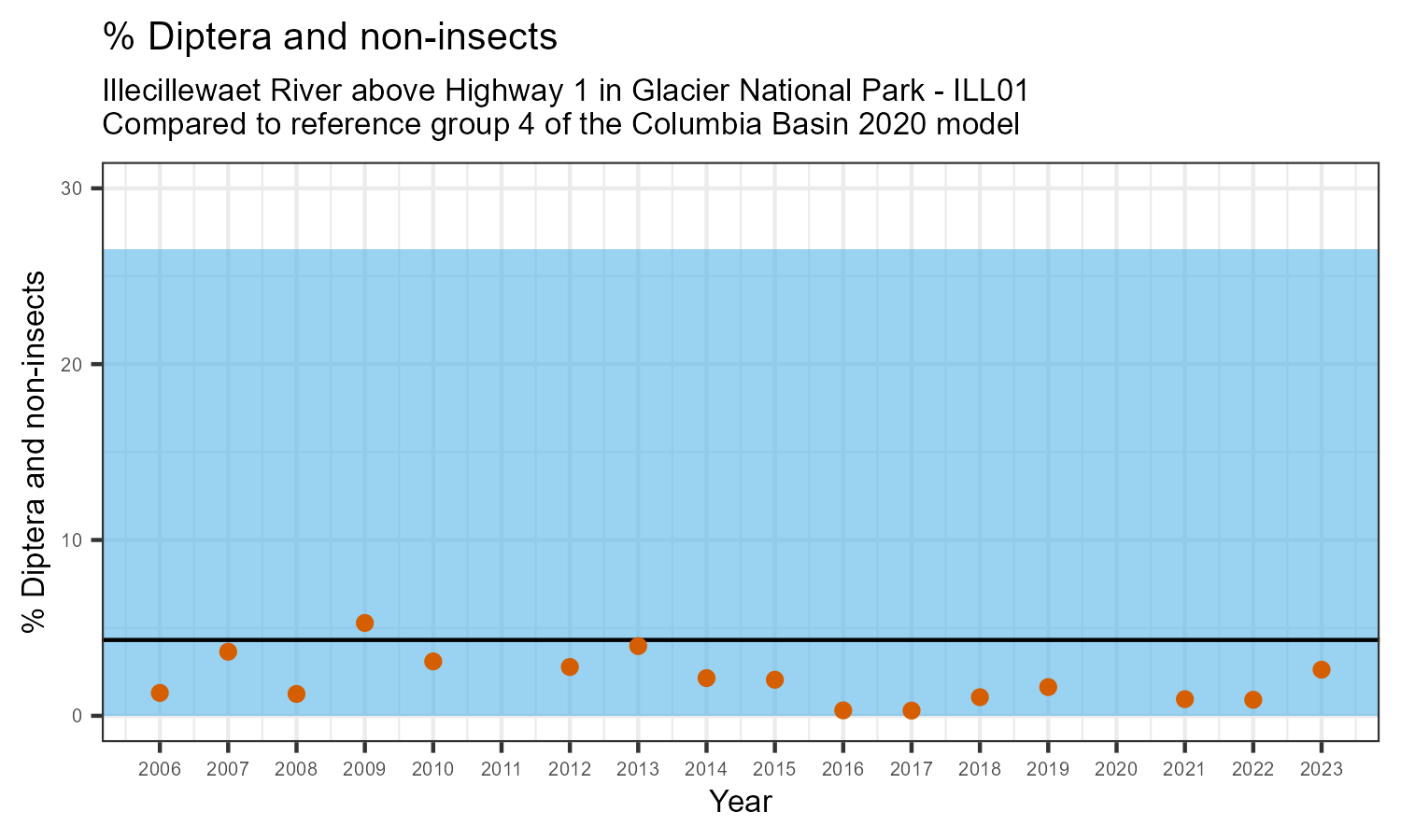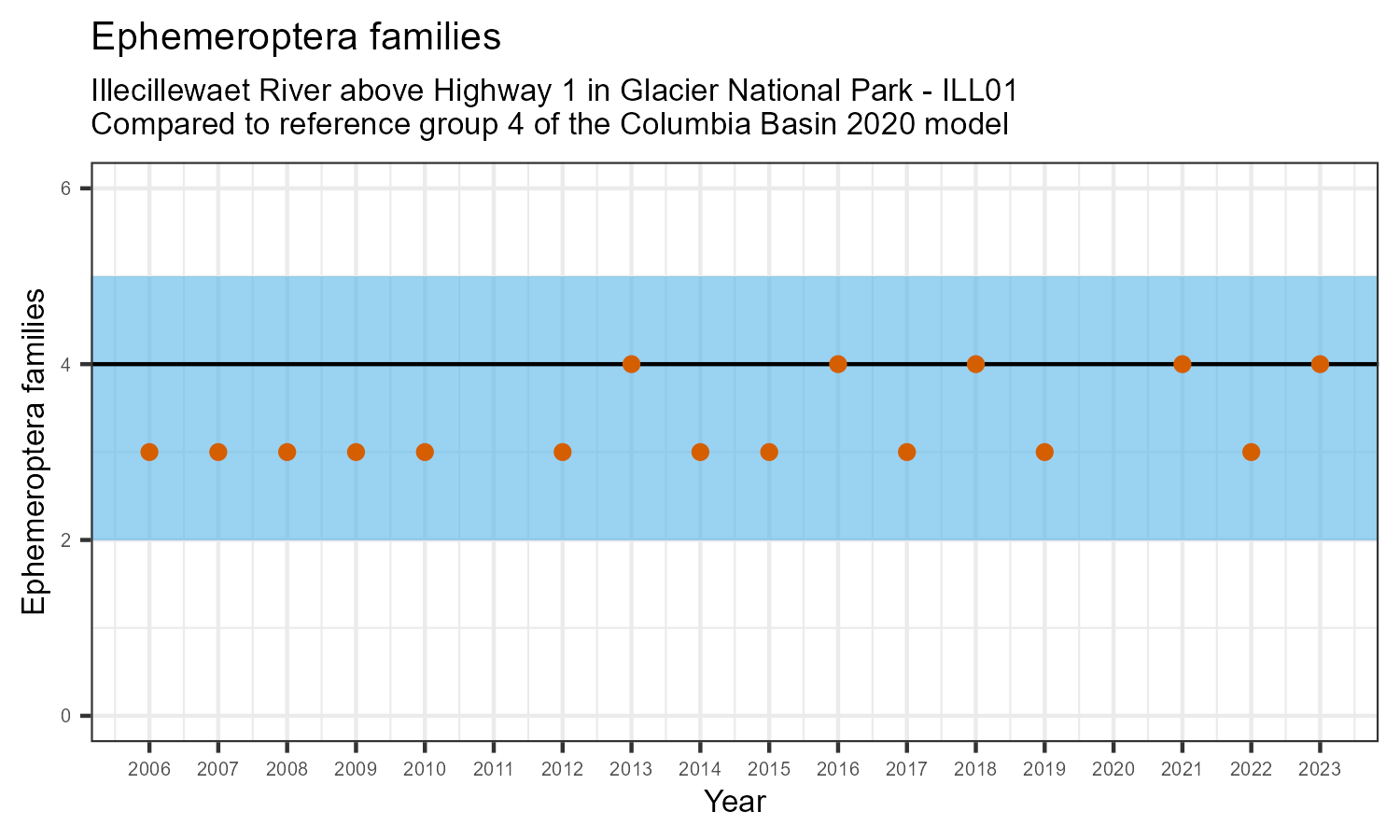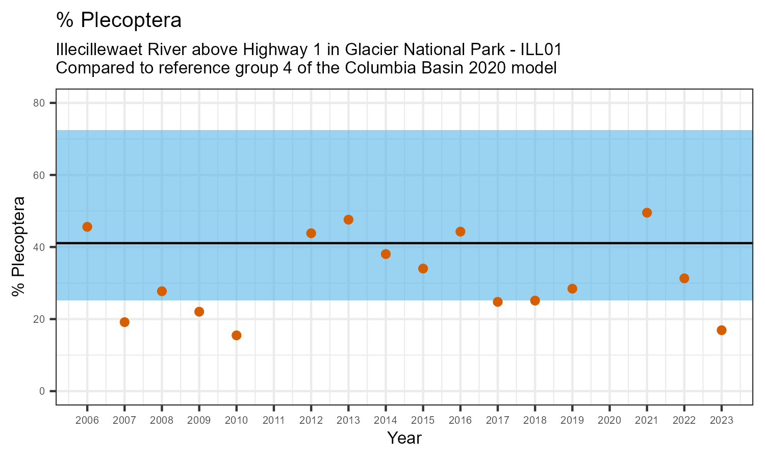 Illecillewaet River above Highway 1 in Glacier National Park is a reference site. Samples from this site are used to update CABIN reference models for the Columbia River basin. Benthic macroinvertebrate community metrics were summarized for the most recent year of sampling (2023) and compared to similar reference sites in the Columbia Basin 2020 reference model.