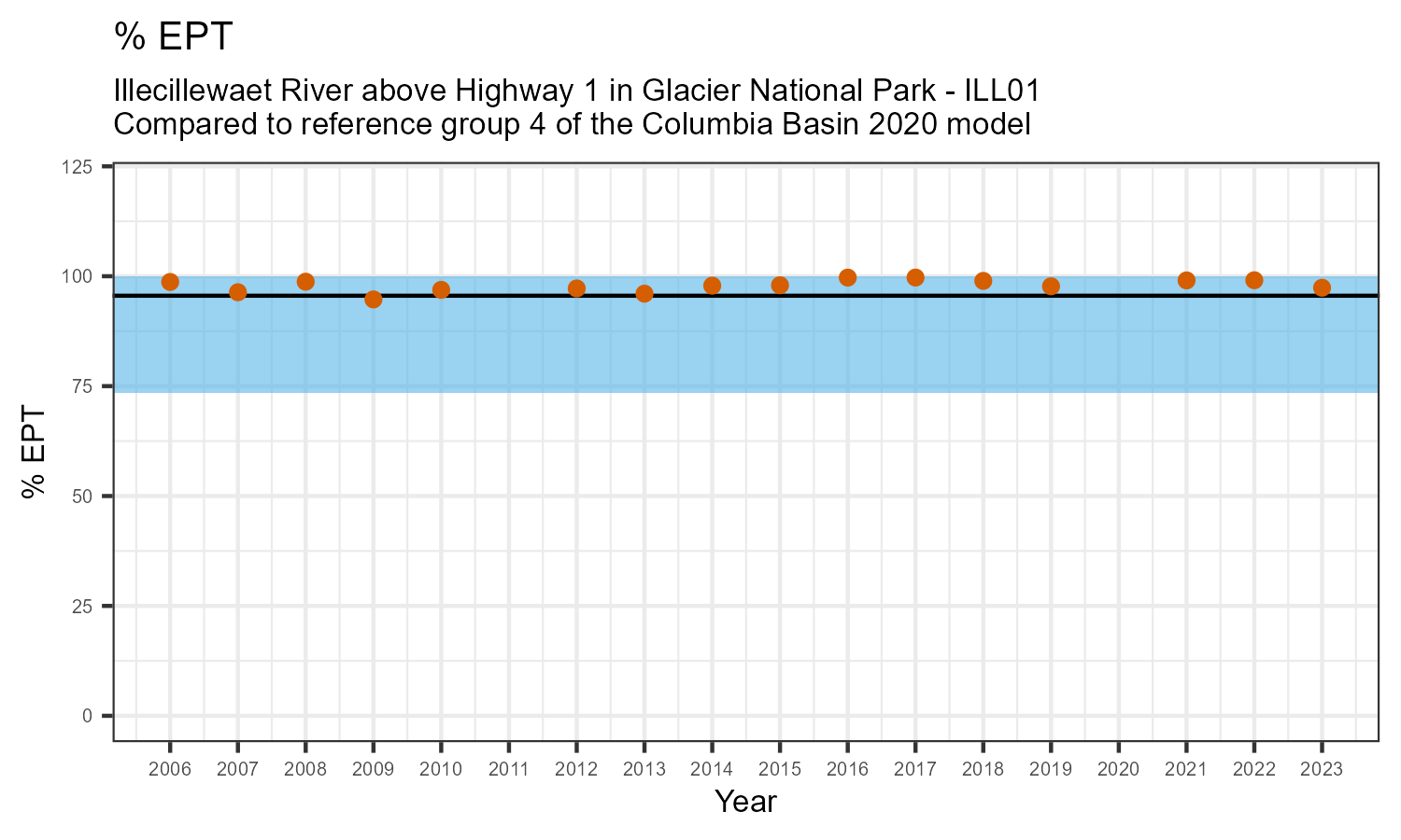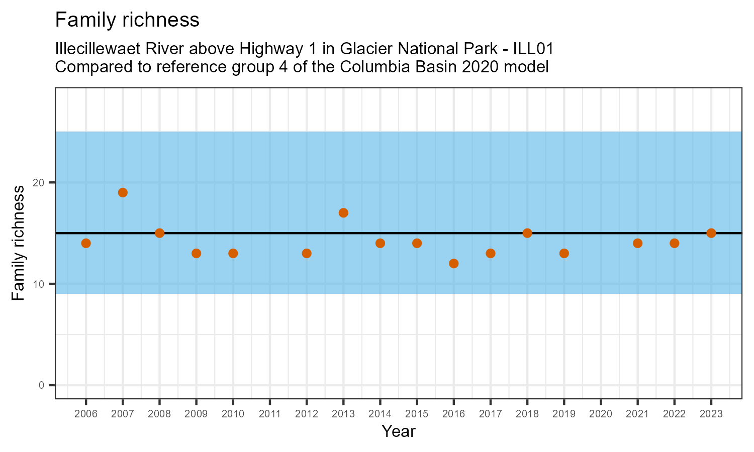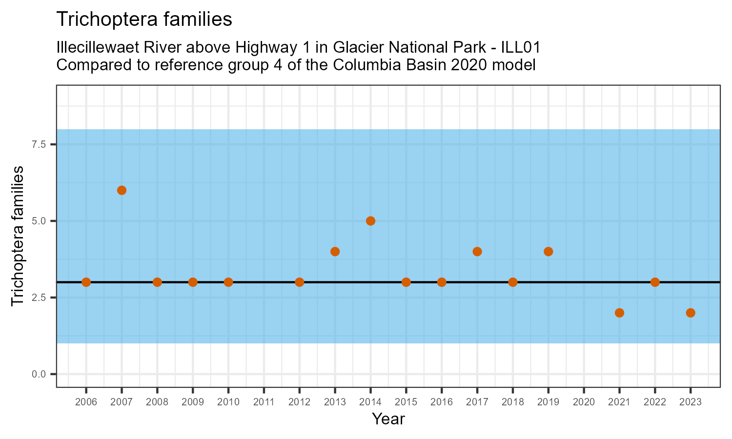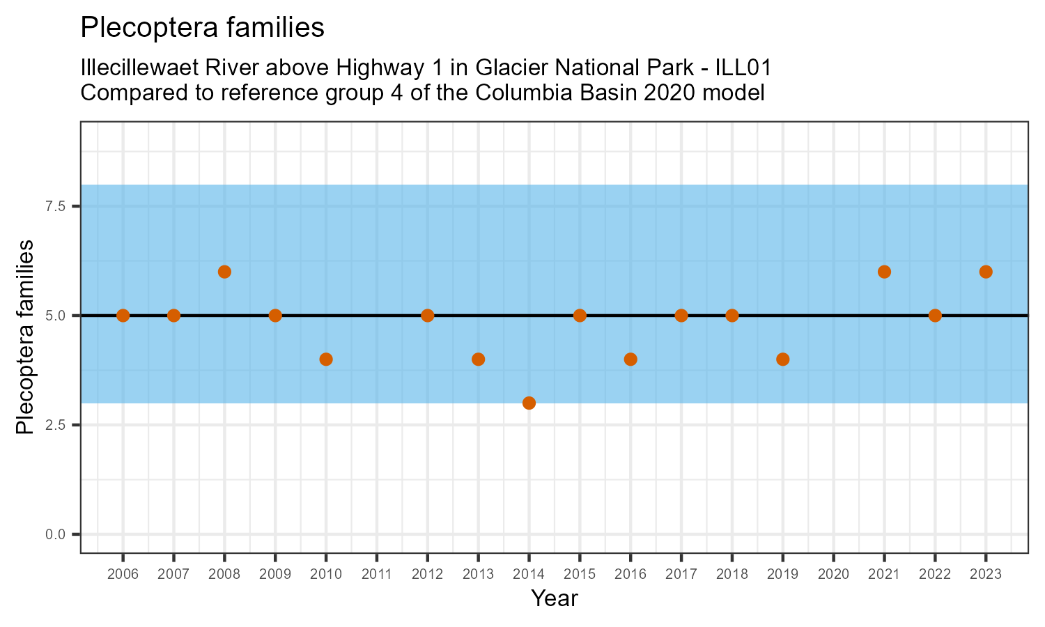 Illecillewaet River above Highway 1 in Glacier National Park is a reference site. Samples from this site are used to update CABIN reference models for the Columbia River basin. Benthic macroinvertebrate community metrics were summarized for the most recent year of sampling (2023) and compared to similar reference sites in the Columbia Basin 2020 reference model.