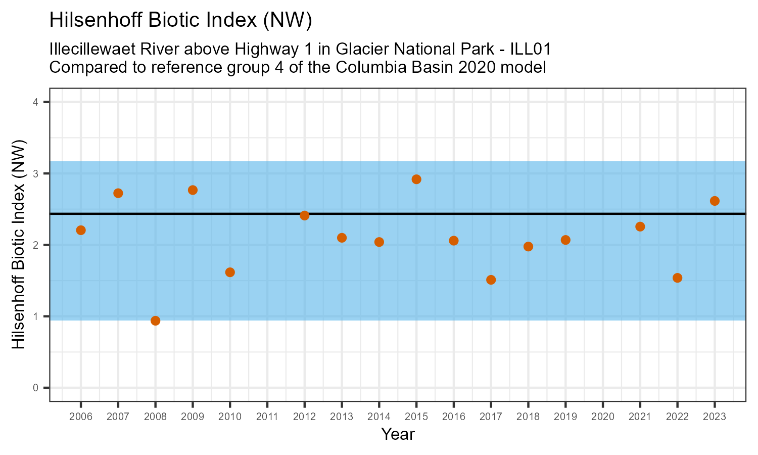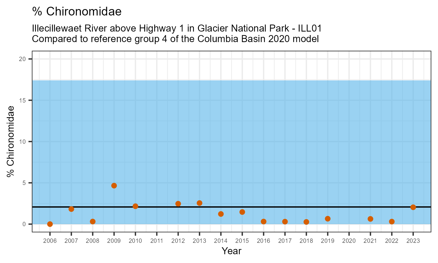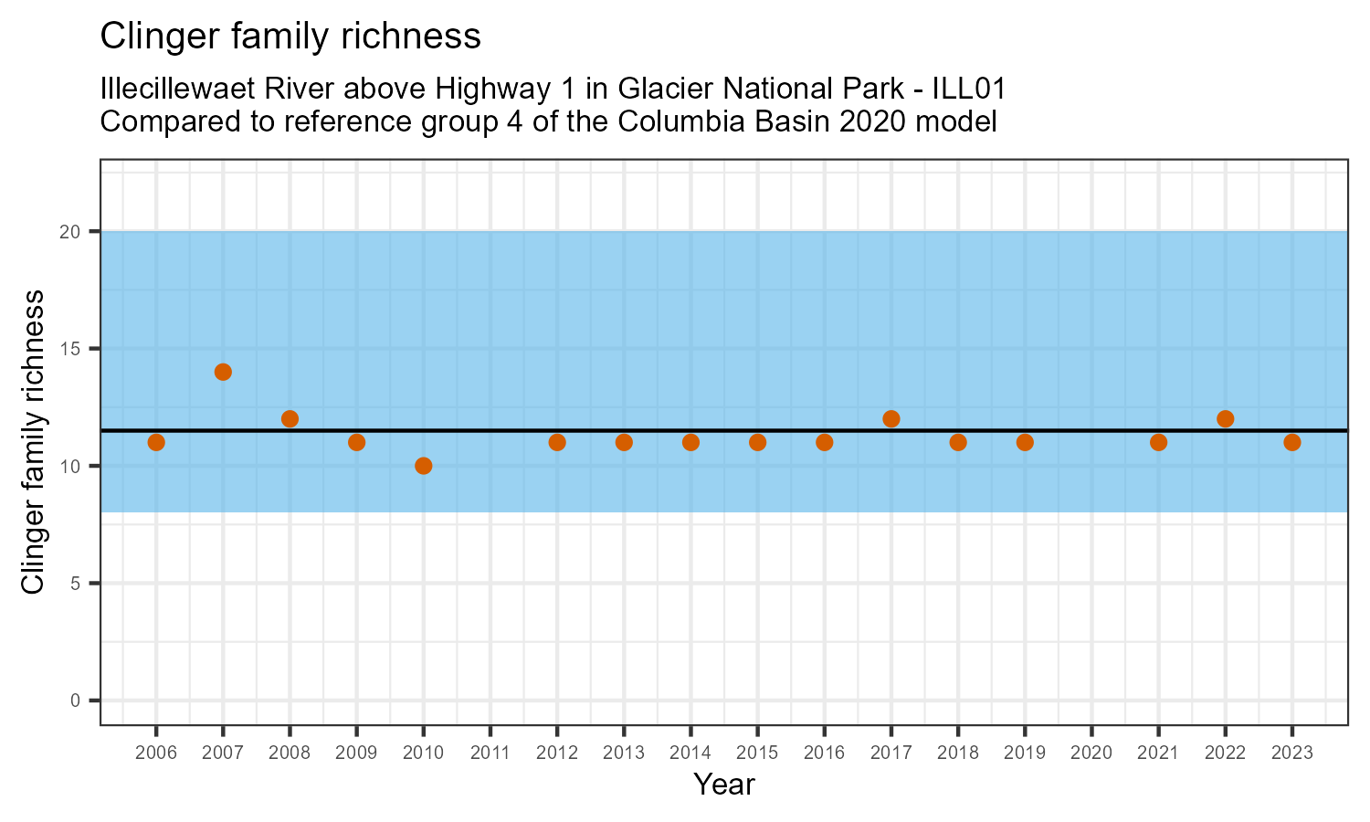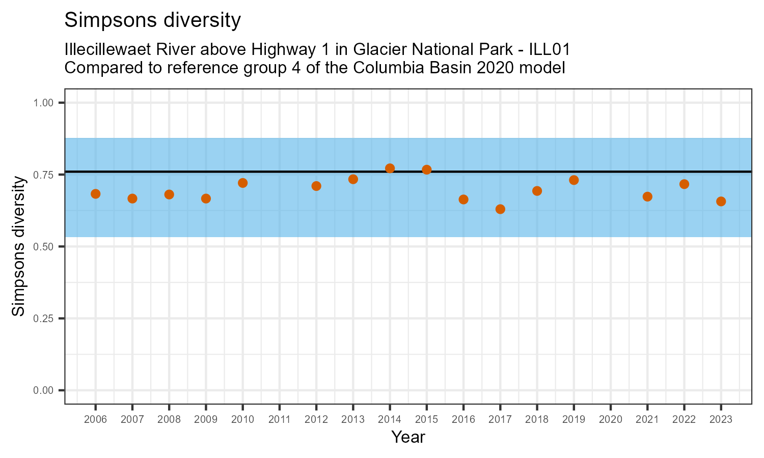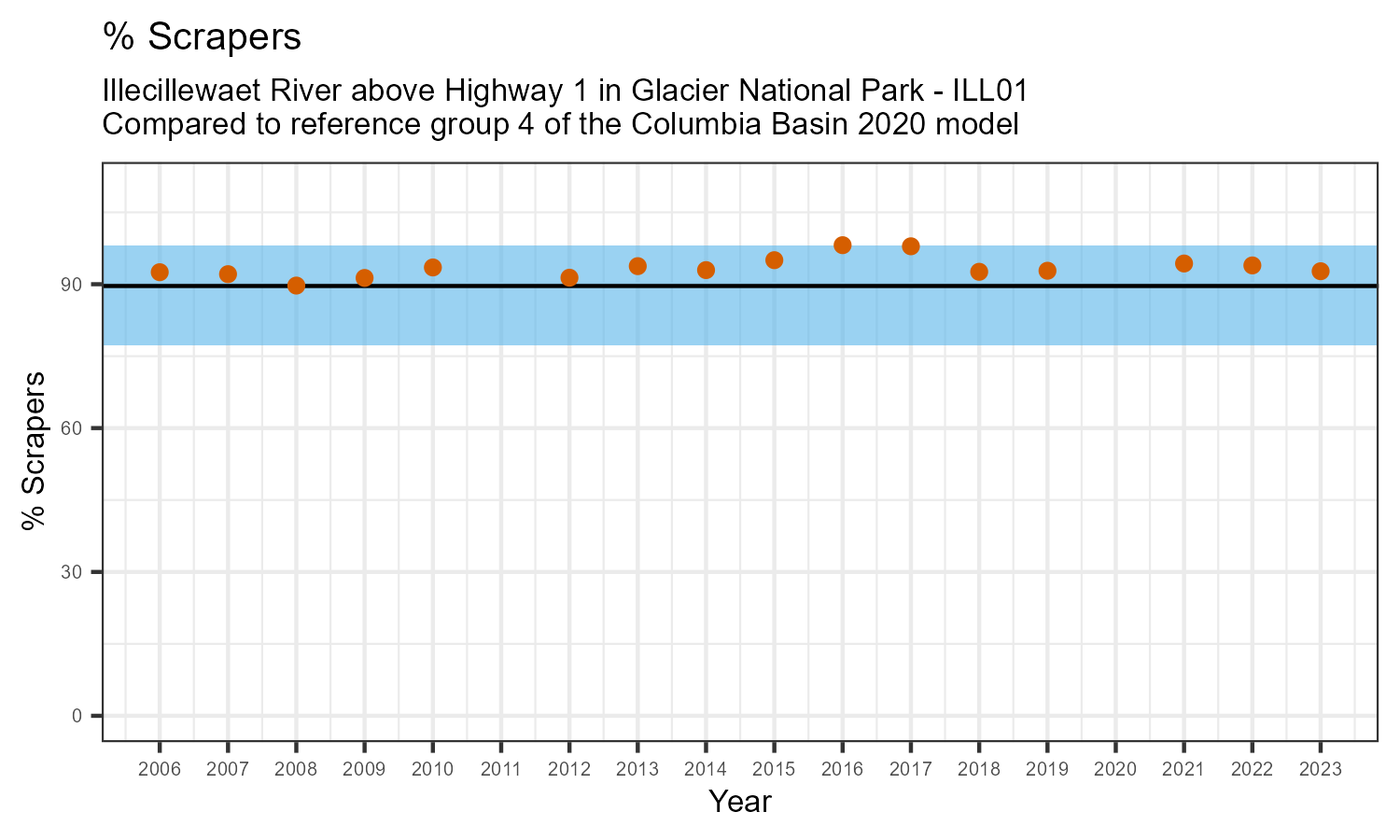 Illecillewaet River above Highway 1 in Glacier National Park is a reference site. Samples from this site are used to update CABIN reference models for the Columbia River basin. Benthic macroinvertebrate community metrics were summarized for the most recent year of sampling (2023) and compared to similar reference sites in the Columbia Basin 2020 reference model.