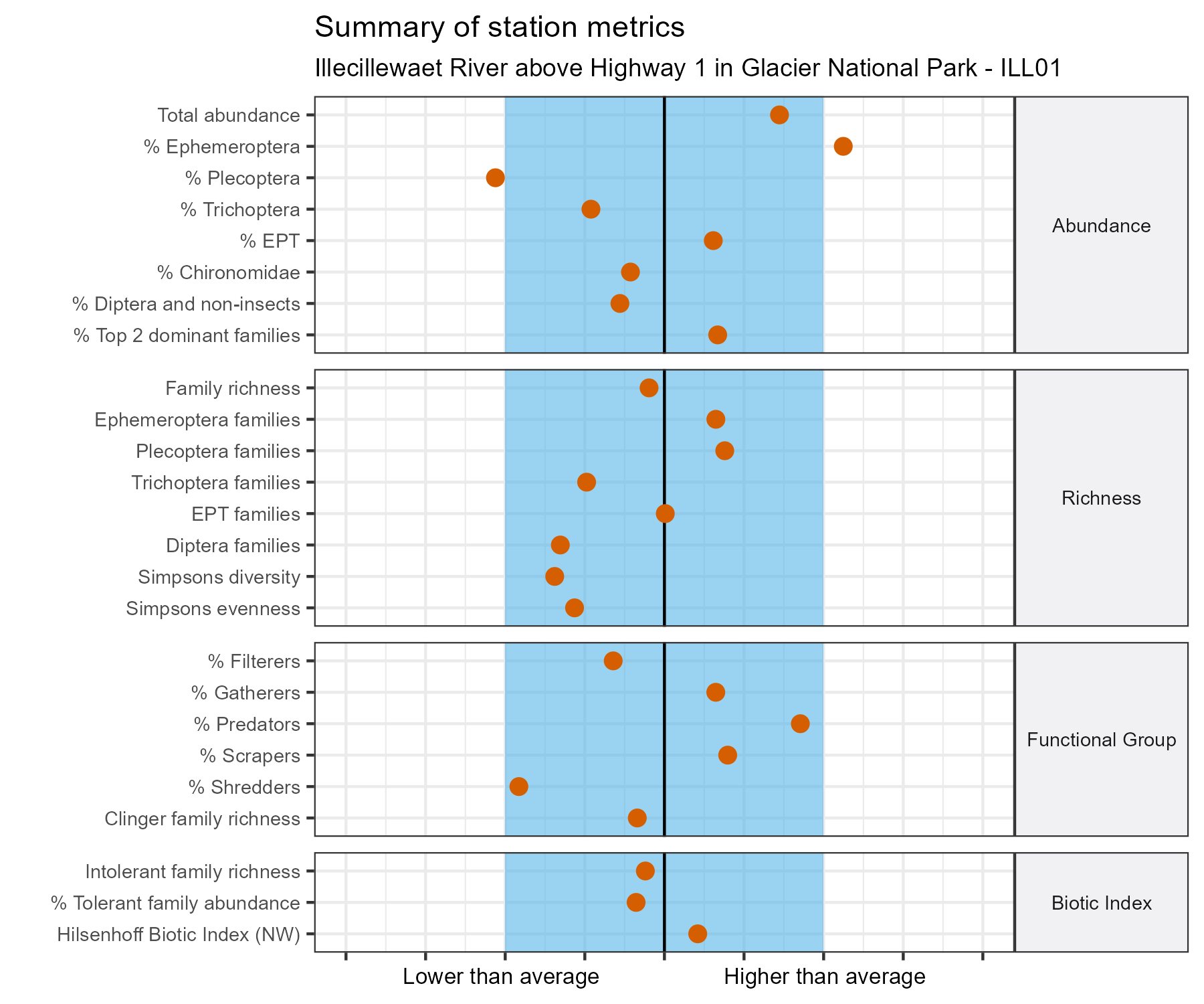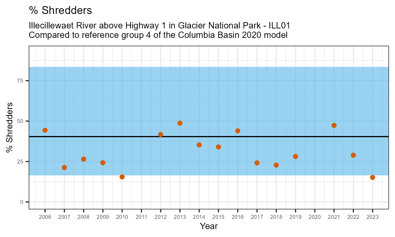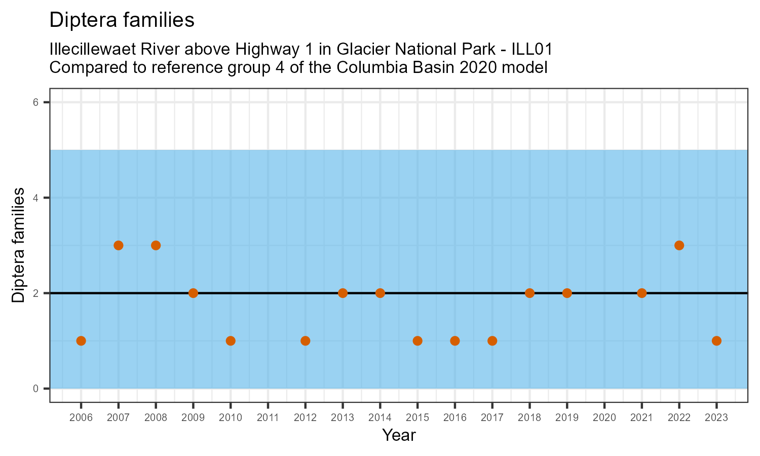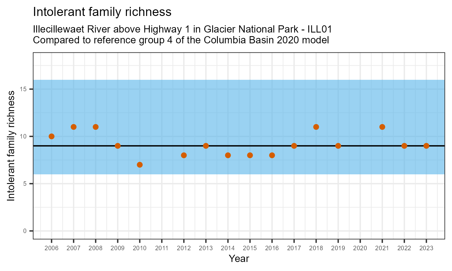 Illecillewaet River above Highway 1 in Glacier National Park is a reference site. Samples from this site are used to update CABIN reference models for the Columbia River basin. Benthic macroinvertebrate community metrics were summarized for the most recent year of sampling (2023) and compared to similar reference sites in the Columbia Basin 2020 reference model.