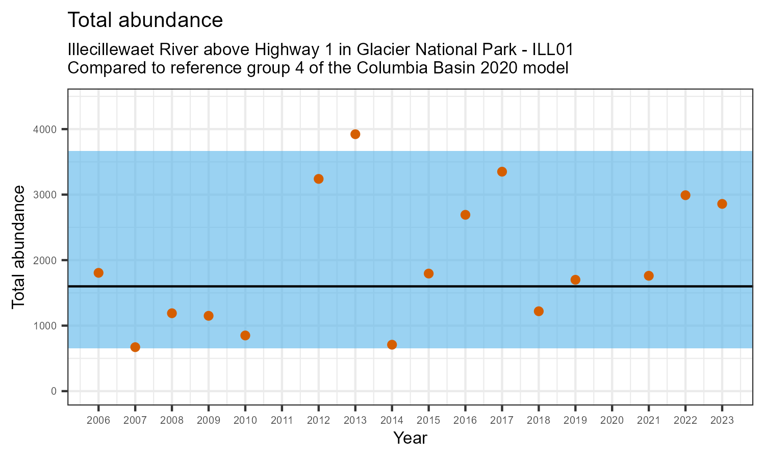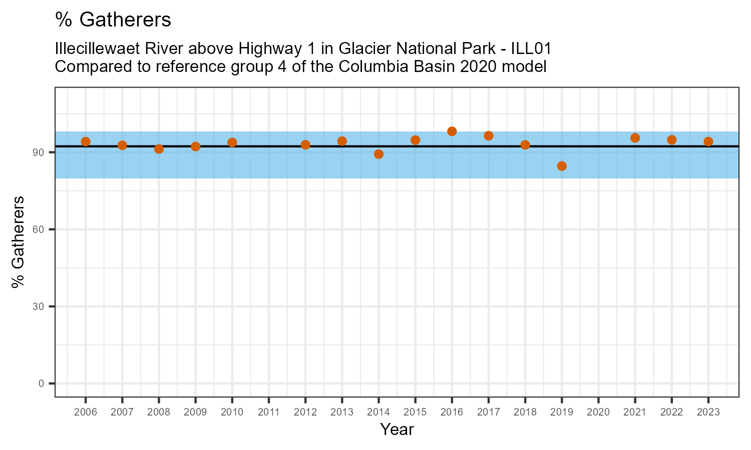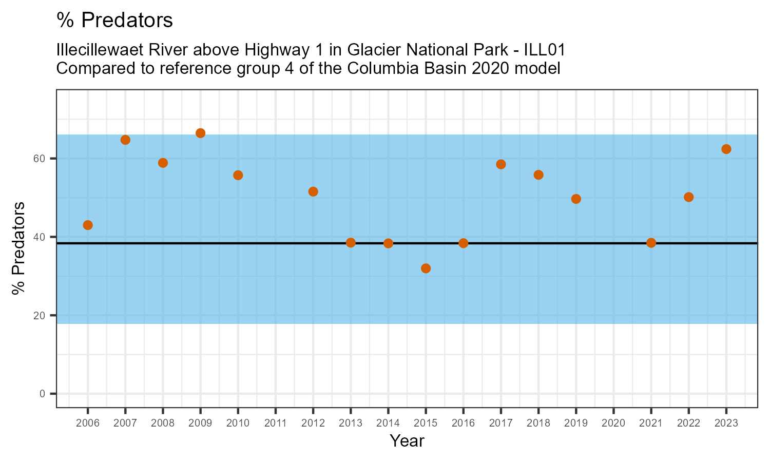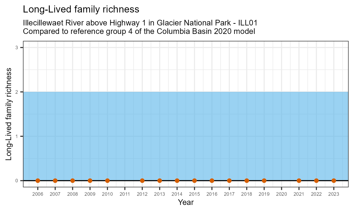 Illecillewaet River above Highway 1 in Glacier National Park is a reference site. Samples from this site are used to update CABIN reference models for the Columbia River basin. Benthic macroinvertebrate community metrics were summarized for the most recent year of sampling (2023) and compared to similar reference sites in the Columbia Basin 2020 reference model.