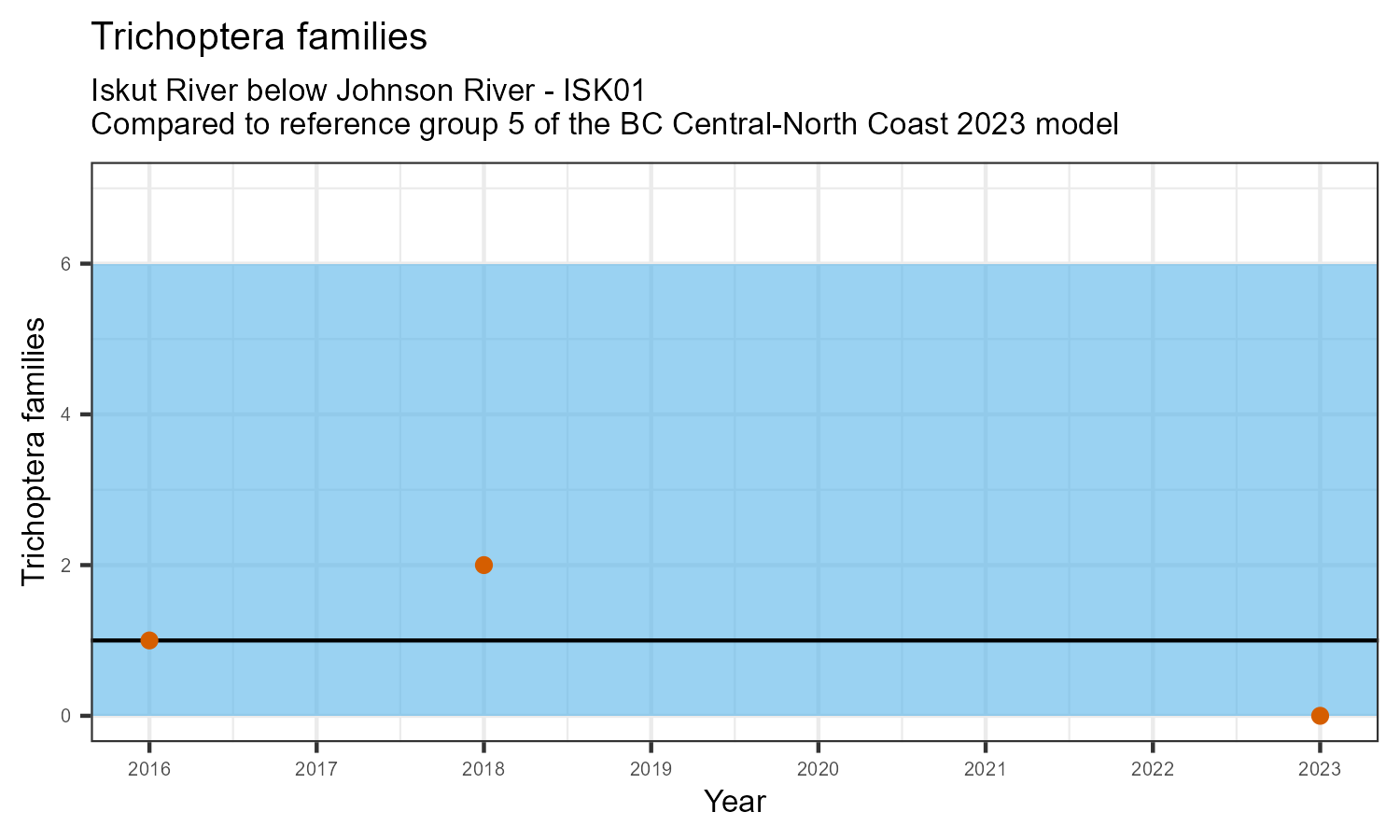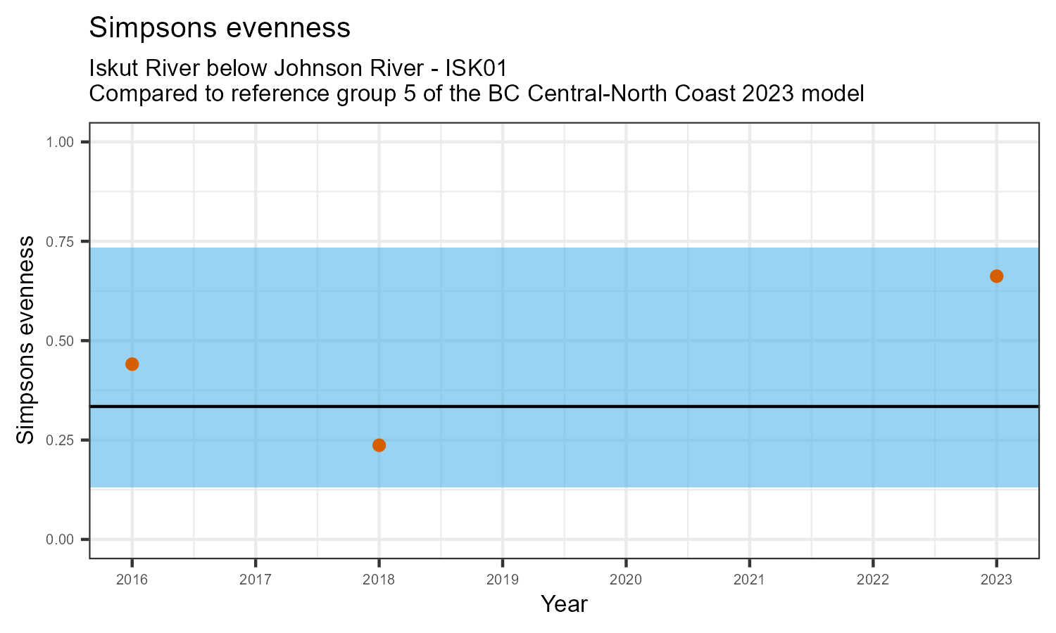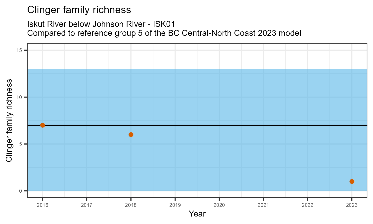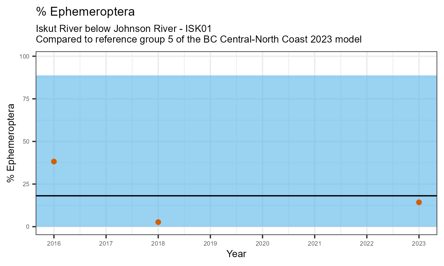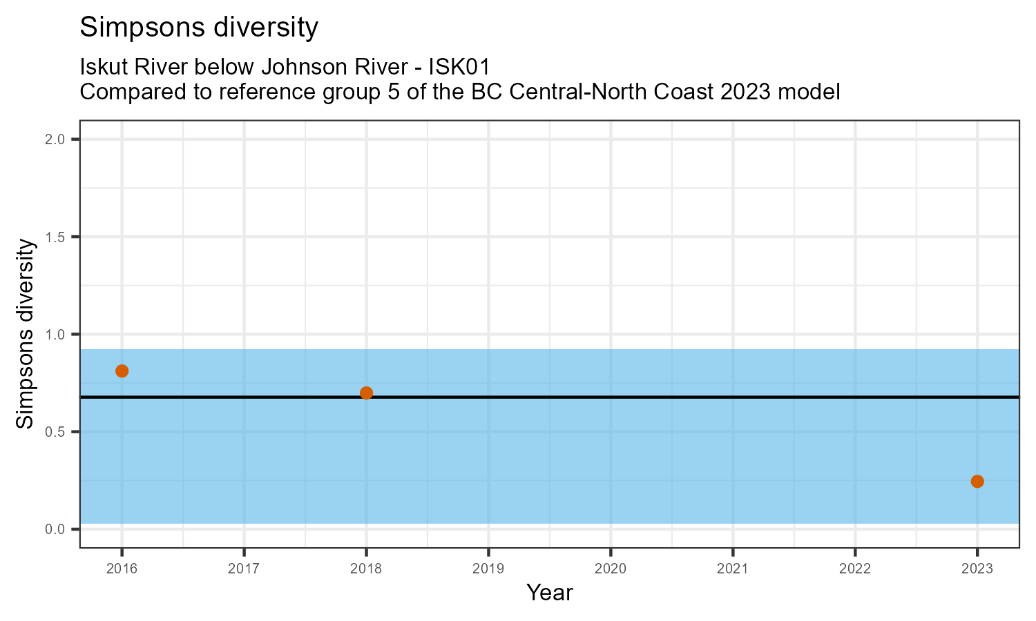 The biological condition at this station was assessed for 2023, the most recent year of sampling. The benthic macroinvertebrate community was analysed by comparing it to similar sites in a CABIN reference model for the BC Central and North coast region.