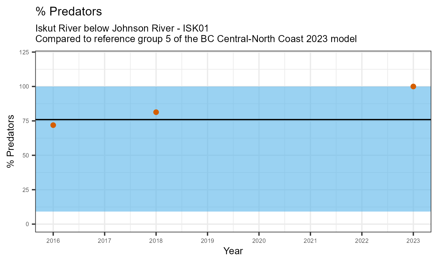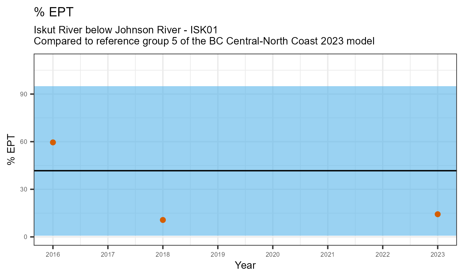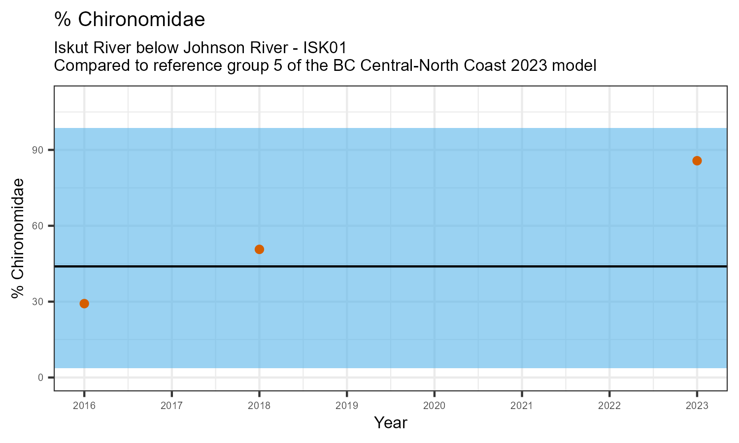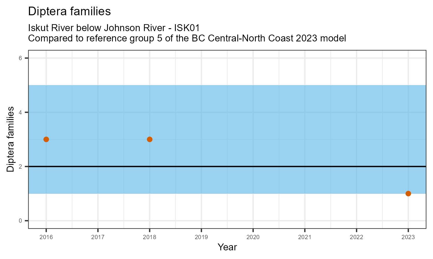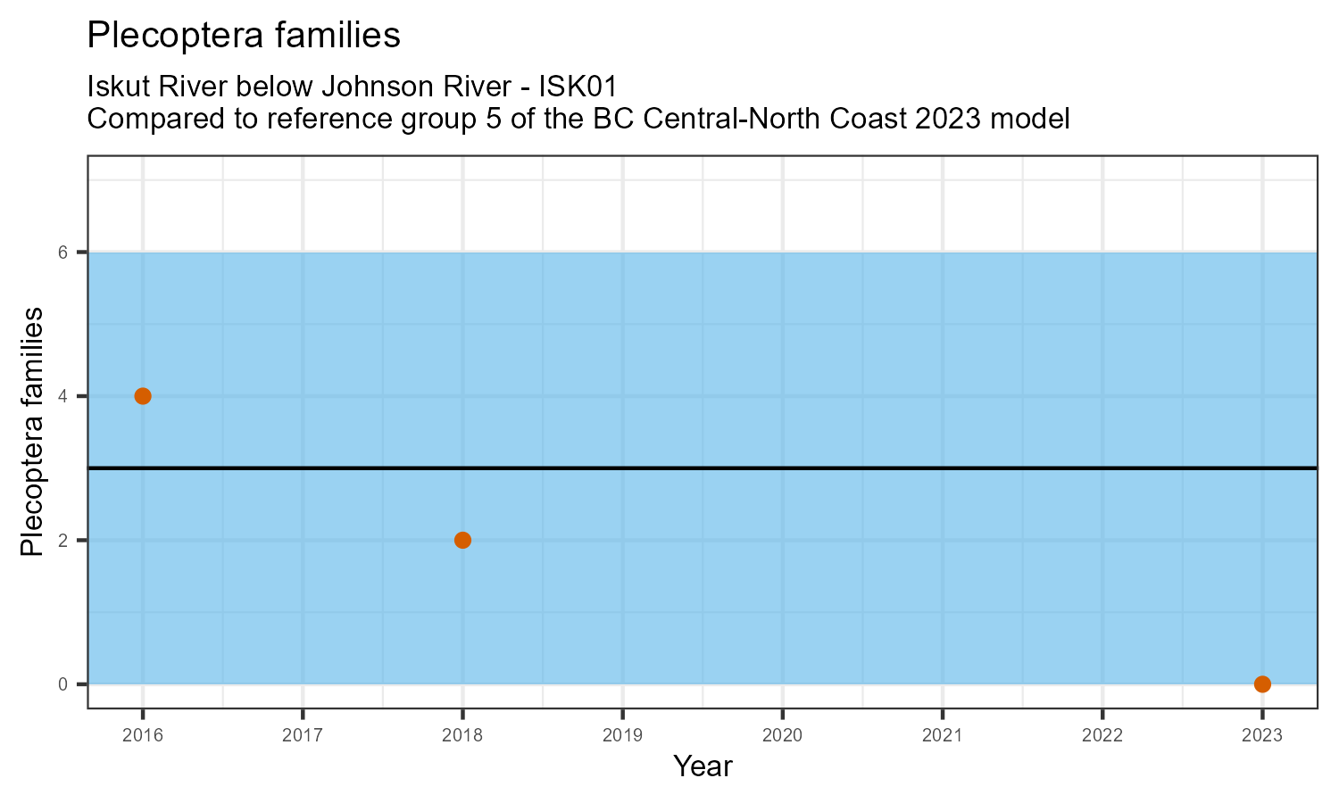 The biological condition at this station was assessed for 2023, the most recent year of sampling. The benthic macroinvertebrate community was analysed by comparing it to similar sites in a CABIN reference model for the BC Central and North coast region.