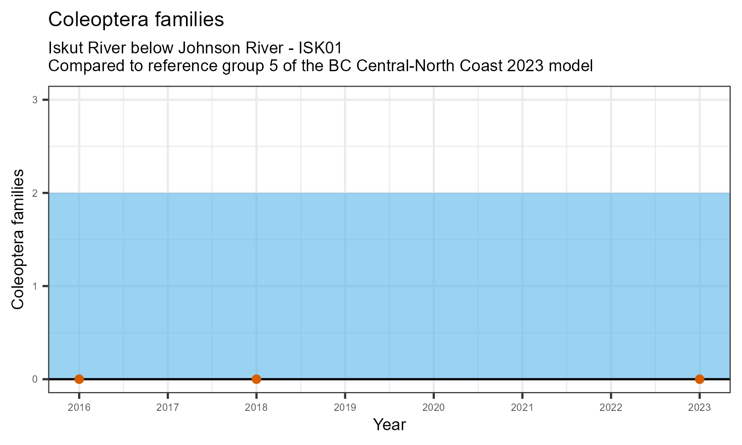 Coleoptera family richness is measured by counting how many taxonomic families belong to the order Coleoptera. Coleoptera are commonly known as beetles, many of which are aquatic or semi-aquatic. They are pollution sensitive, so Coleoptera family richness may decrease in response to habitat disturbances like poor water quality.