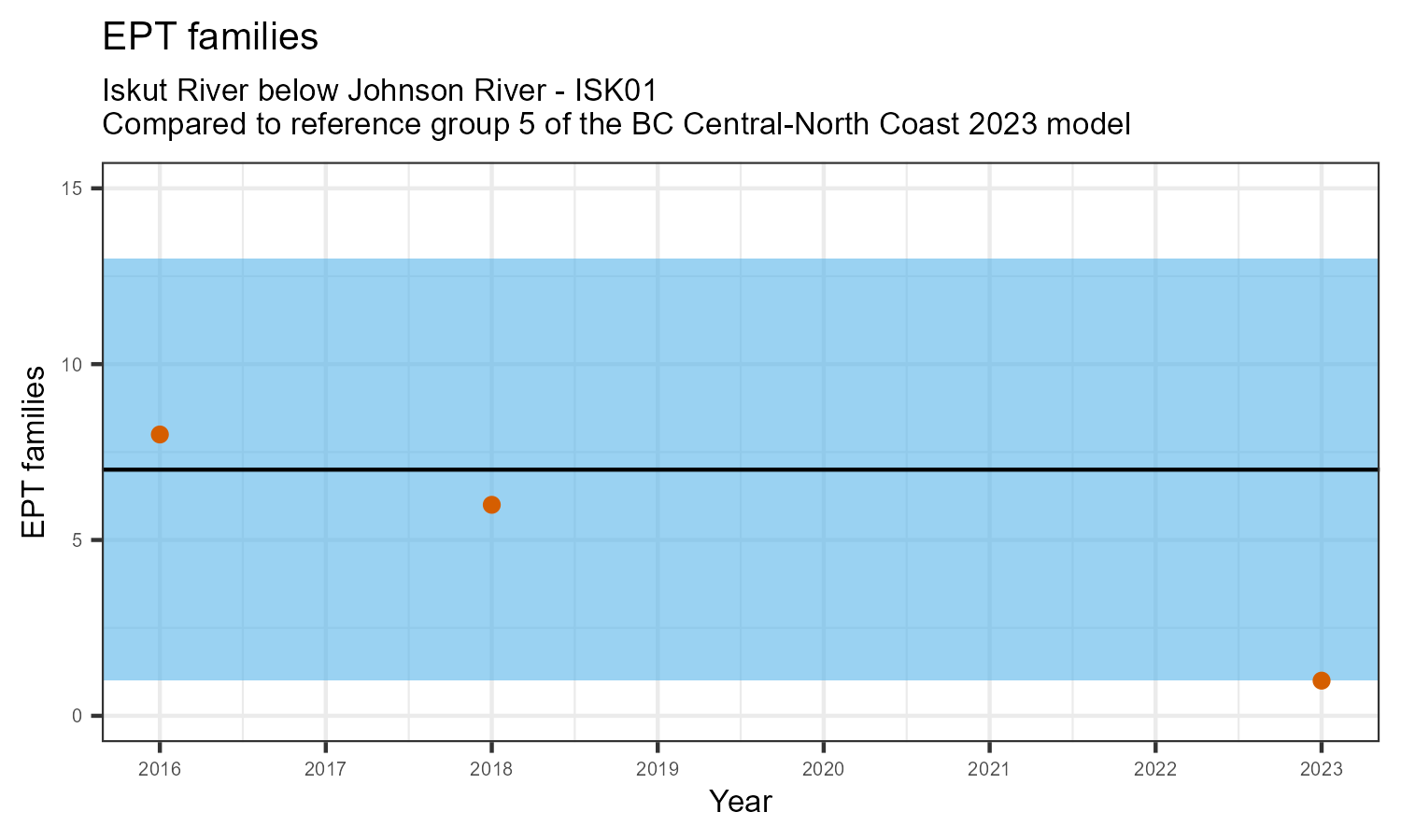 EPT family richness is measured by counting how many taxonomic families belong to one of the pollution sensitive EPT orders: Ephemeroptera (mayflies), Plecoptera (stoneflies), or Trichoptera (caddisflies). EPT family richness may decrease in response to habitat disturbances like poor water quality.