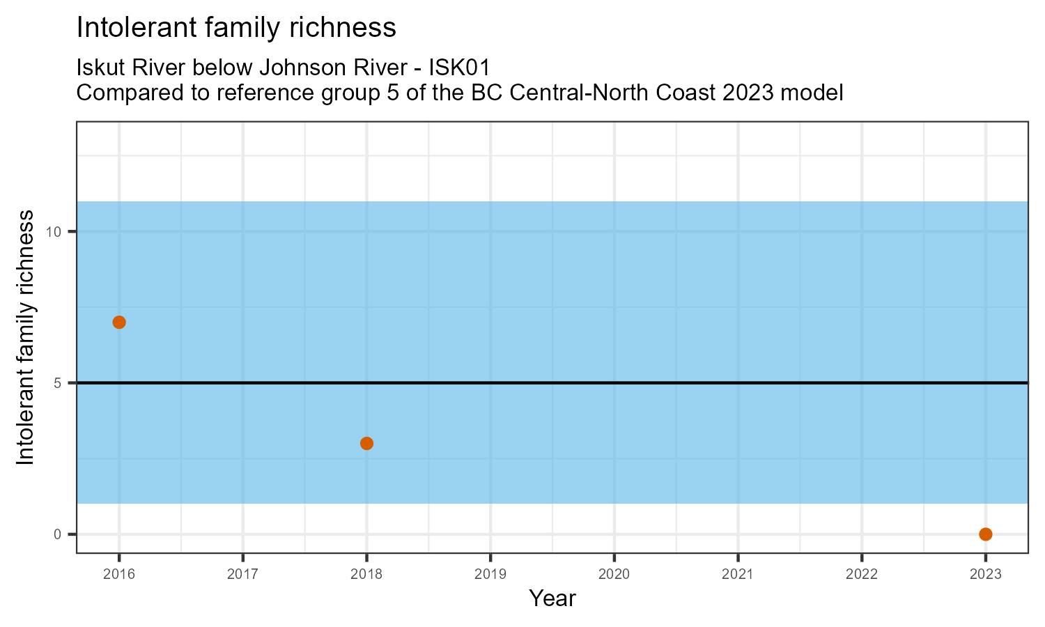 Intolerant family richness counts the number of taxonomic families that are sensitive (intolerant) to pollution, according to the Hilsenhoff Biotic Index. Intolerant family richness may decrease as water pollution increases.