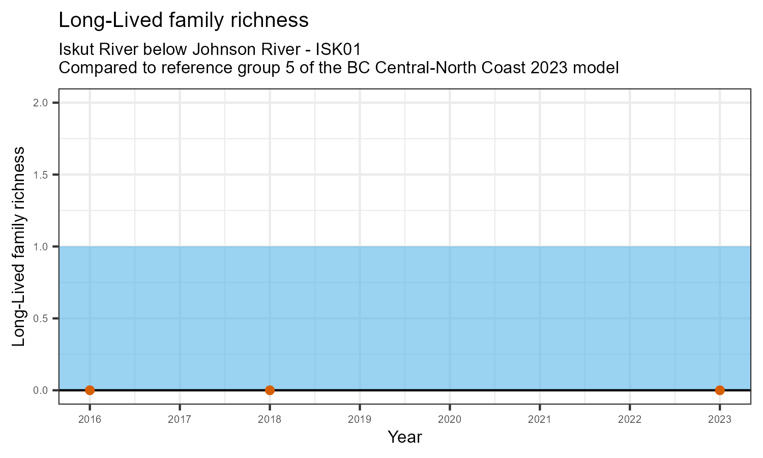 Long-lived family richness counts the number of taxonomic families that need more than 1 year to complete their life cycle. These families have been exposed to conditions in the water over a longer period. They provide information on historical and current water quality conditions. The number of long-lived families may decrease in response to habitat disturbances like poor water quality.
