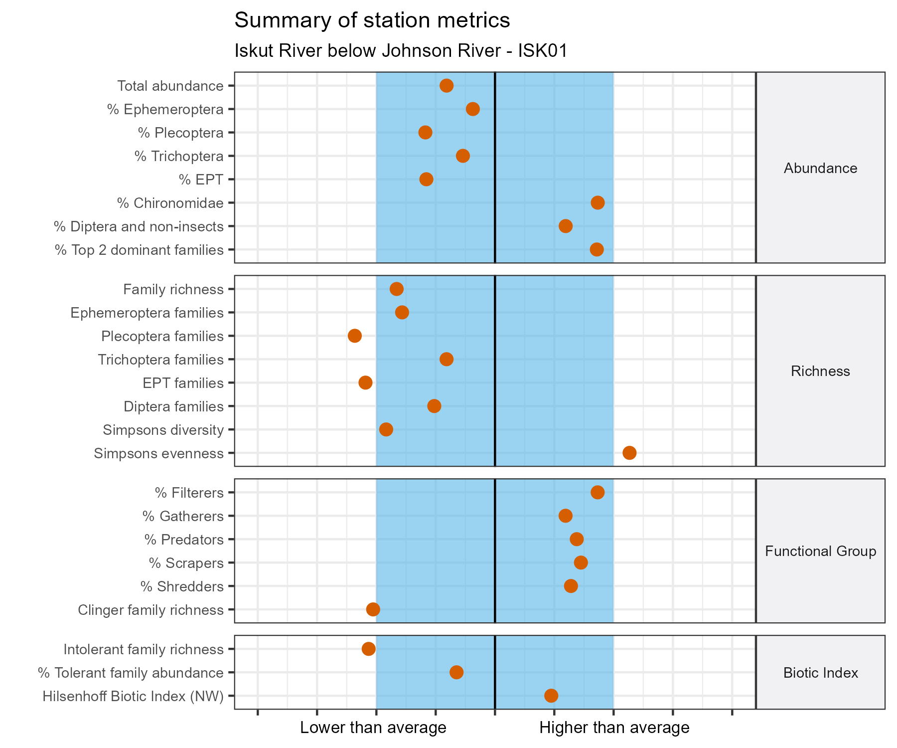 The graph below compares various metrics of the benthic macroinvertebrate community at this station ( ● ) to the natural variation of values at similar reference sites (▮). The black line represents the average value in the reference group for each metric.