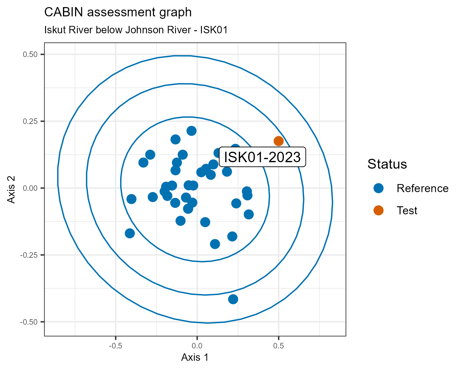 A CABIN assessment considers this water quality monitoring station the “test” site, and compares it to a group of sites with similar habitat features from the BC Central-North Coast 2023 CABIN reference model. Sites in the reference model have little or no human activity in their watersheds, so they are considered to represent pristine or best possible biological conditions. If the test site is close to the reference sites on the plot, it is also considered to be in good biological condition.