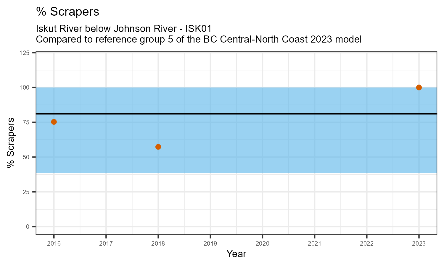 % Scrapers is the proportion of taxonomic familes present that feed by grazing on the algae growing on rocks and other underwater surfaces. The proportion of scrapers is expected to decrease at a site in response to disturbance.