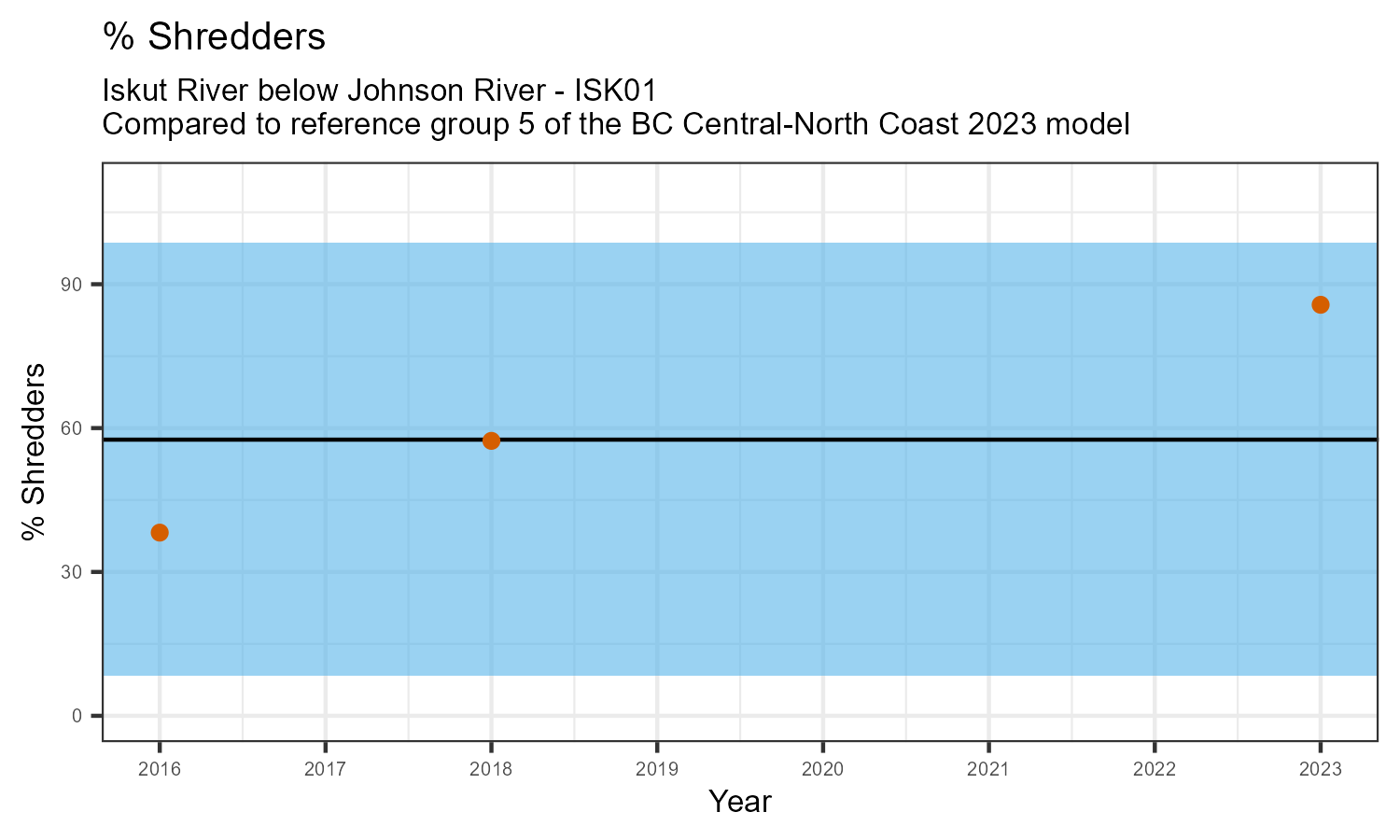 % Shredders is the proportion of taxonomic familes present that feed on leaf litter and other coarse particulate organic matter in the water. The proportion of shredders is expected to decrease at a site in response to disturbance.