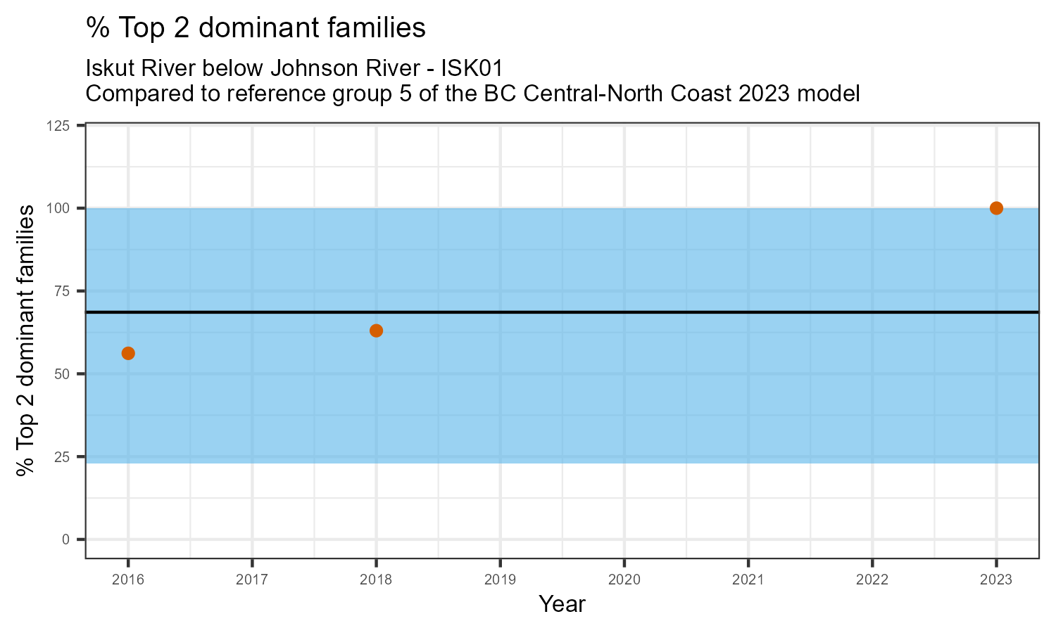 % Top 2 dominant families is the proportion of the total sample represented by the two most abundant families of invertebrates. A healthy aquatic community should have a balance of many types of invertebrates. If only one or two families dominate the community, this can be a sign of habitat disturbance. The percentage of the two most dominant families in the community may increase in response to disturbance.