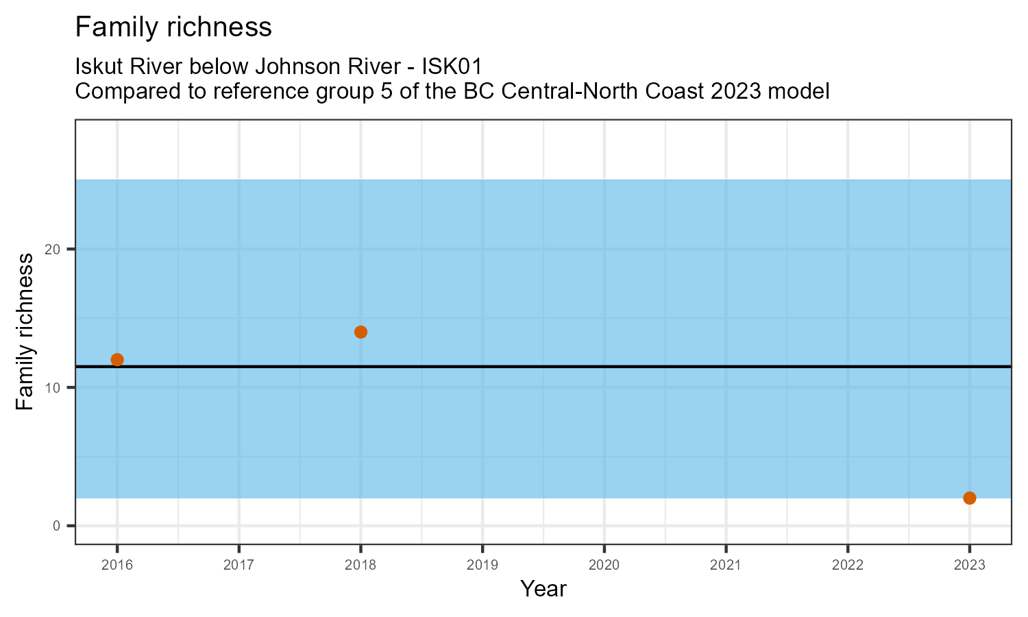 Family richness is the total number of taxonomic families identified. Family richness can decline in response to habitat disturbances or introduction of invasive species.