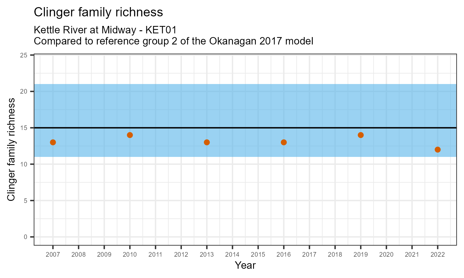 For each metric shown in the graph, the value at this station has been standarized by the standard deviation of the values from the relevant reference model group (in this case, Group 2 of the Okanagan 2017 reference model). The black line represents the mean value for that metric in the reference group. The blue bar represents two standard deviations of the reference group above and below the mean.
