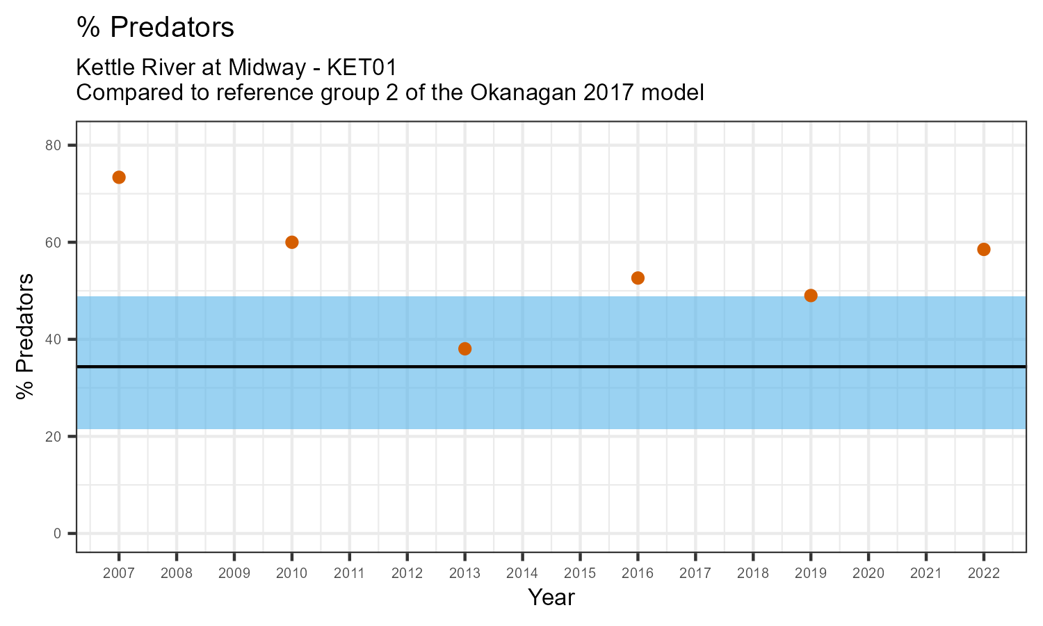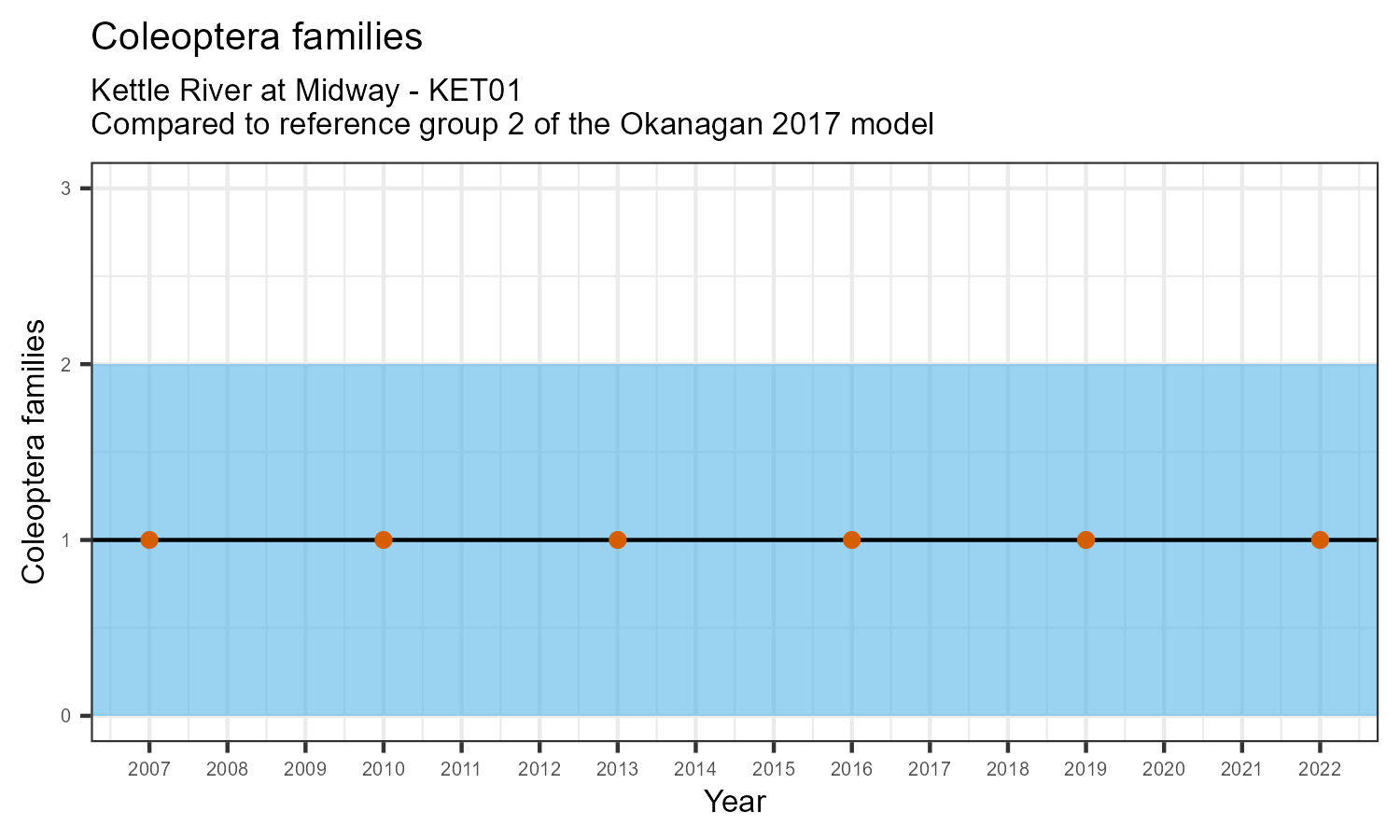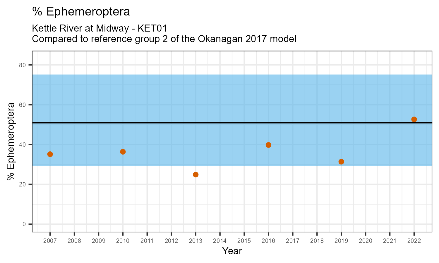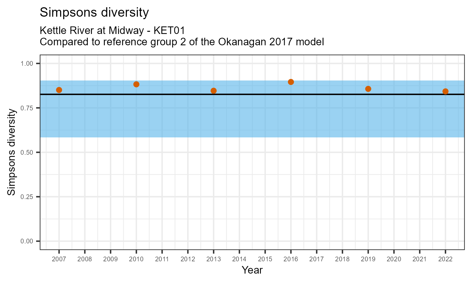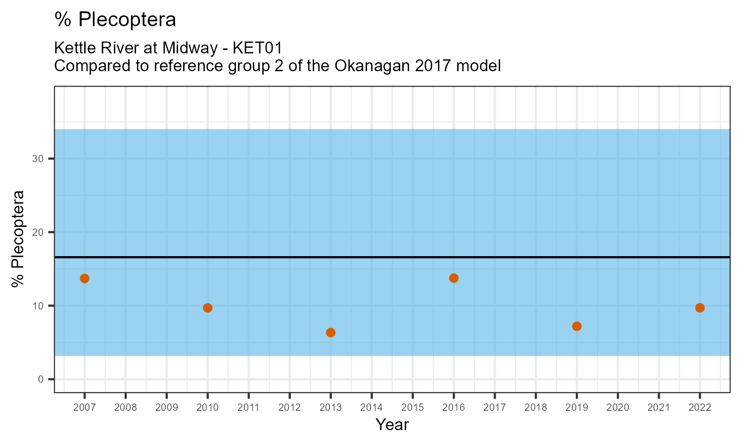The biological condition at this station was assessed for 2022, the most recent year of sampling. The benthic macroinvertebrate community was analysed by comparing it to similar sites in a CABIN reference model for the Okanagan region.