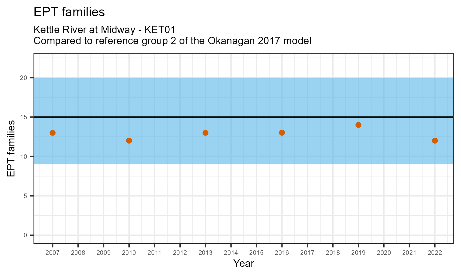 EPT family richness is measured by counting how many taxonomic families belong to one of the pollution sensitive EPT orders: Ephemeroptera (mayflies), Plecoptera (stoneflies), or Trichoptera (caddisflies). EPT family richness may decrease in response to habitat disturbances like poor water quality.
