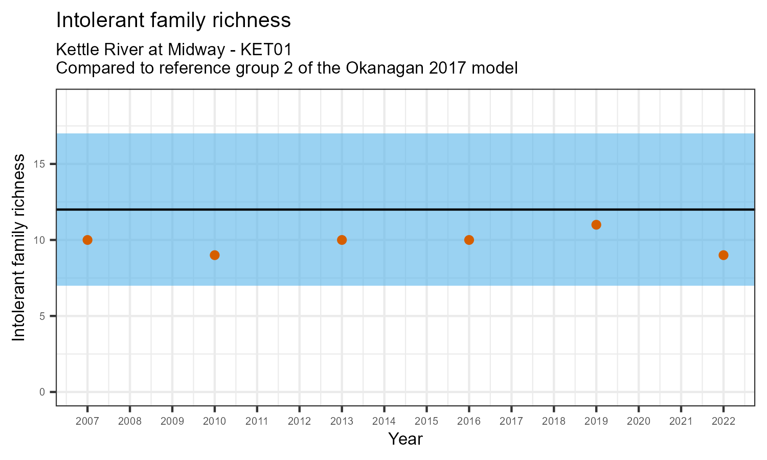 Intolerant family richness counts the number of taxonomic families that are sensitive (intolerant) to pollution, according to the Hilsenhoff Biotic Index. Intolerant family richness may decrease as water pollution increases.