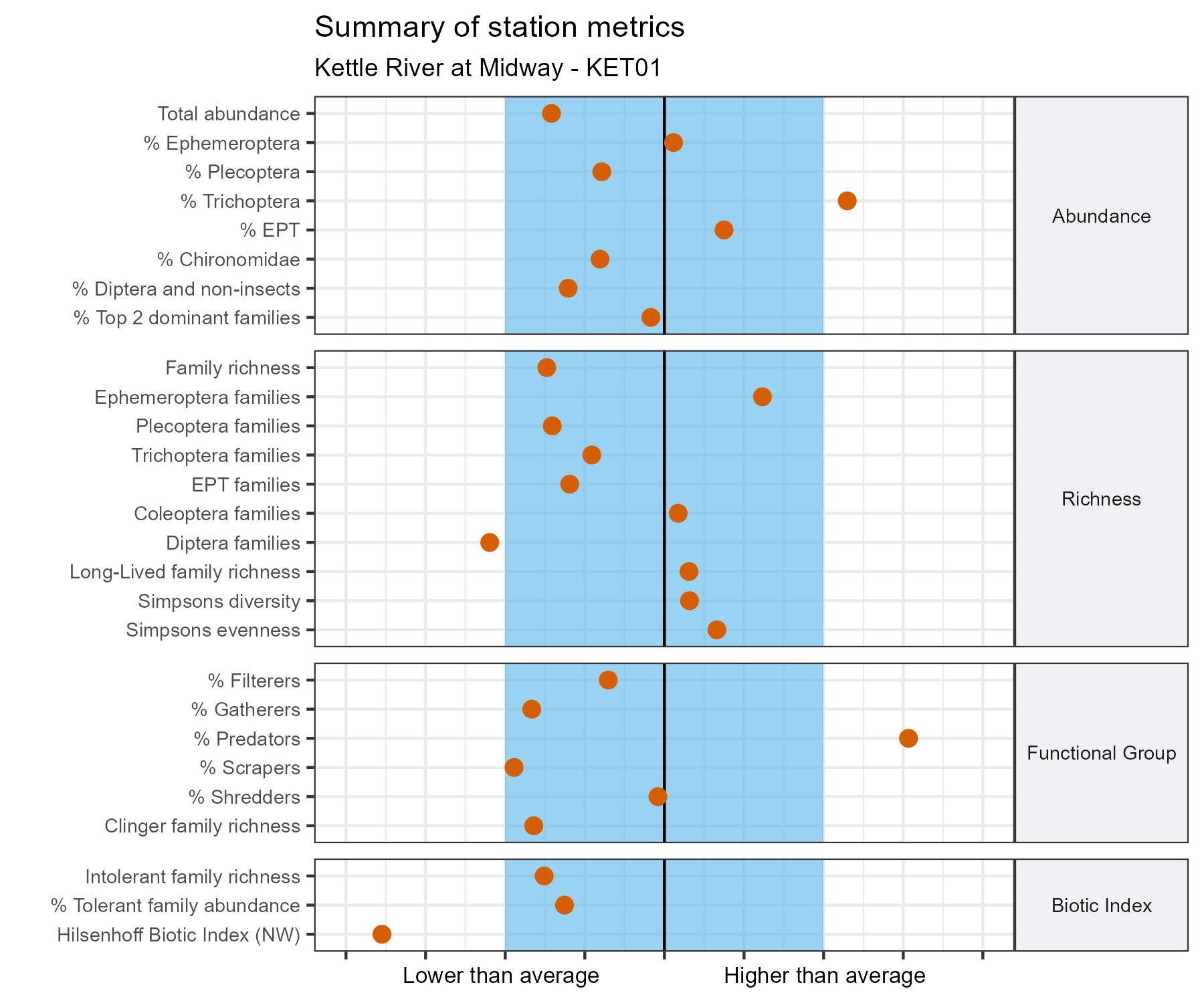 The graph below compares various metrics of the benthic macroinvertebrate community at this station ( ● ) to the natural variation of values at similar reference sites (▮). The black line represents the average value in the reference group for each metric.