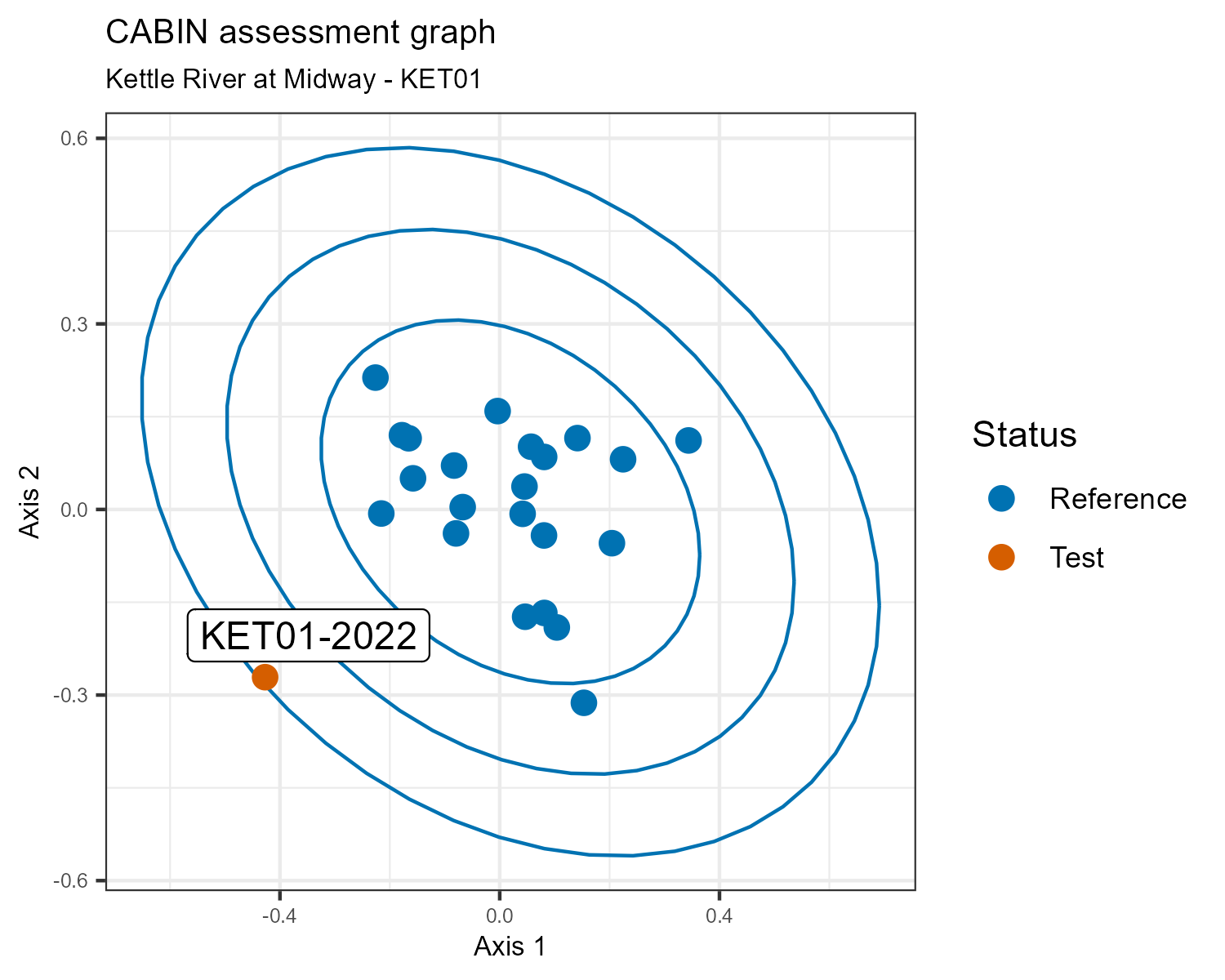 Three confidence ellipses are drawn around the group of reference sites at the 90%, 99%, and 99.9% confidence levels. The 90% ellipse is the innermost ellipse, and 90% of sites in reference condition should fall within it. The ellipses divide the plot into the four assessment categories a test site may fall into: Similar to Reference (within 90% ellipse), Mildly Divergent (90% to 99% ellipse), Divergent (99% to 99.9% ellipse), and Highly Divergent (outside the 99.9% ellipse).