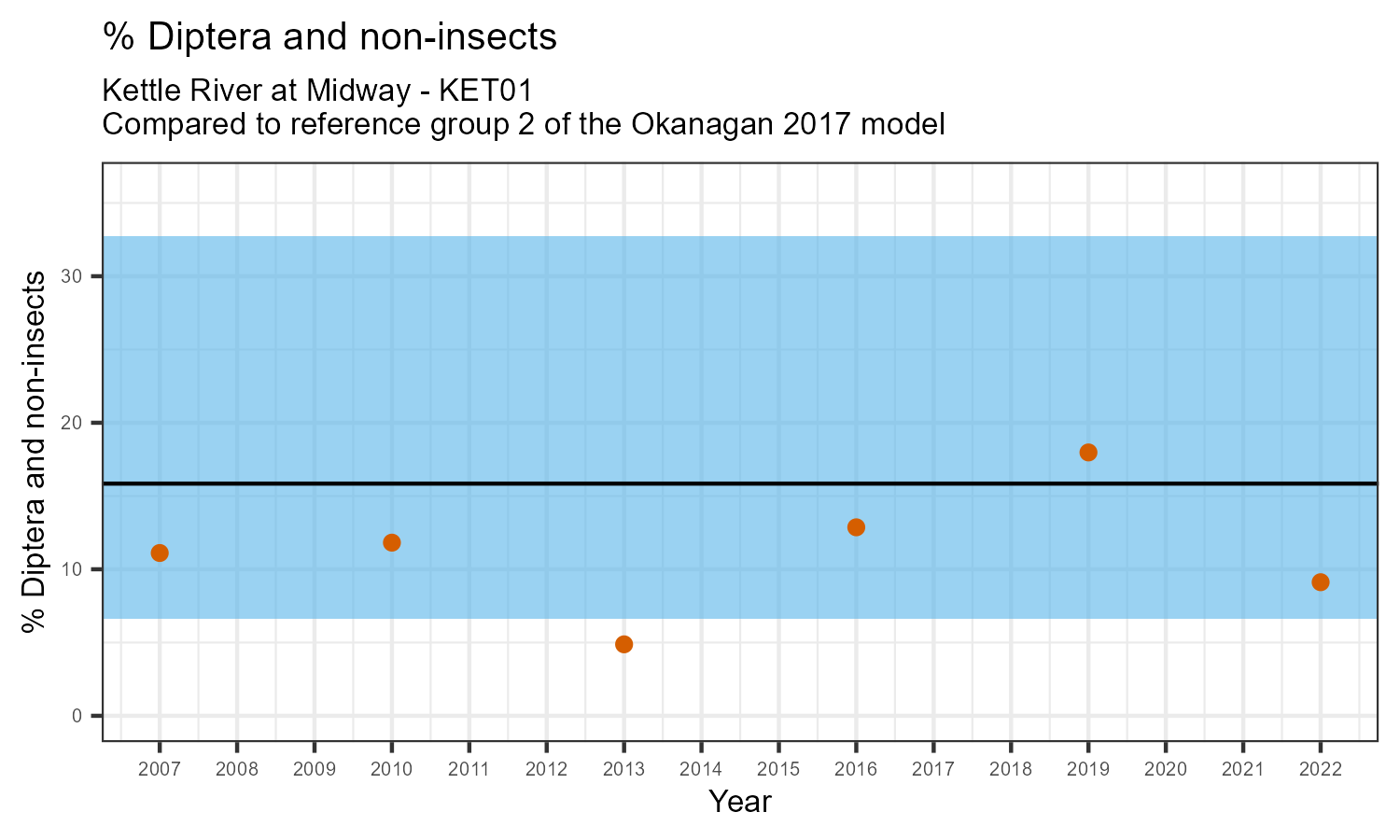 % Diptera and non-insects is the proportion of invertebrates that either are not insects, or are insects in the taxonomic order Diptera. Diptera are flies, and along with non-insects they represent the more pollution tolerant members of the aquatic community. The % Diptera and non-insects may increase in response to habitat disturbances like poor water quality.