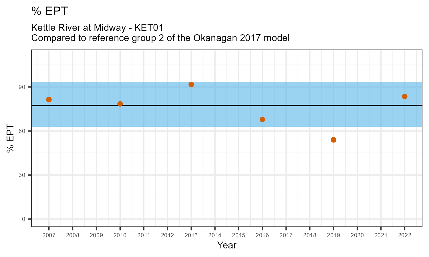 % EPT is the proportion of invertebrates that belong to one of the taxonomic orders of Ephemeroptera (mayflies), Plecoptera (stoneflies), or Trichoptera (caddisflies). These types of insects are often grouped together under the term “EPT”. They are typically the most sensitive to habitat disturbances like poor water quality.