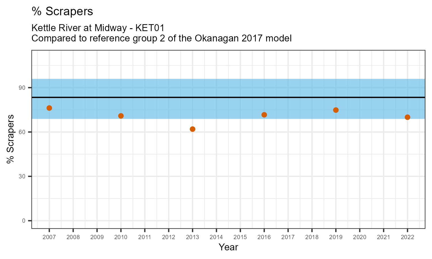 % Scrapers is the proportion of taxonomic familes present that feed by grazing on the algae growing on rocks and other underwater surfaces. The proportion of scrapers is expected to decrease at a site in response to disturbance.